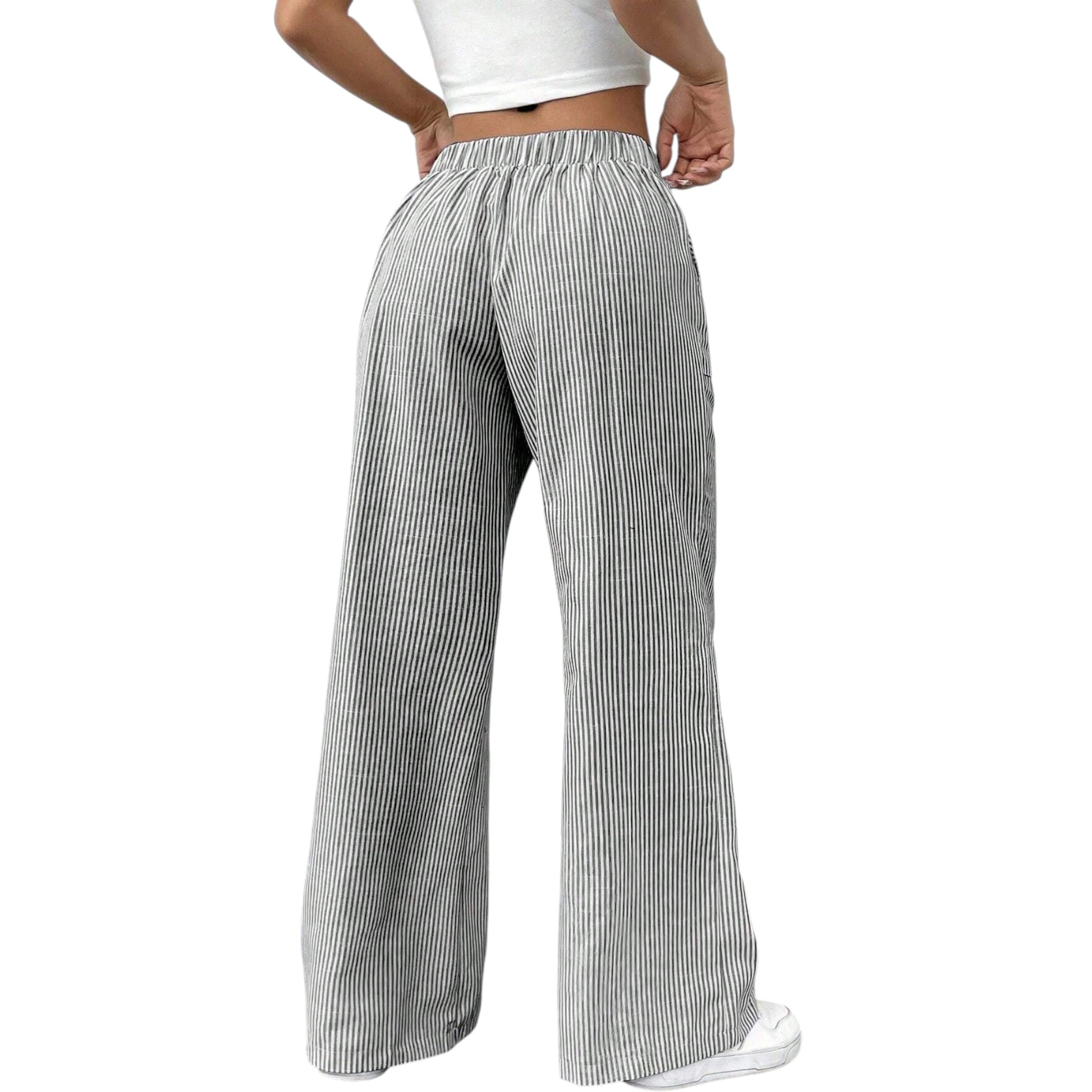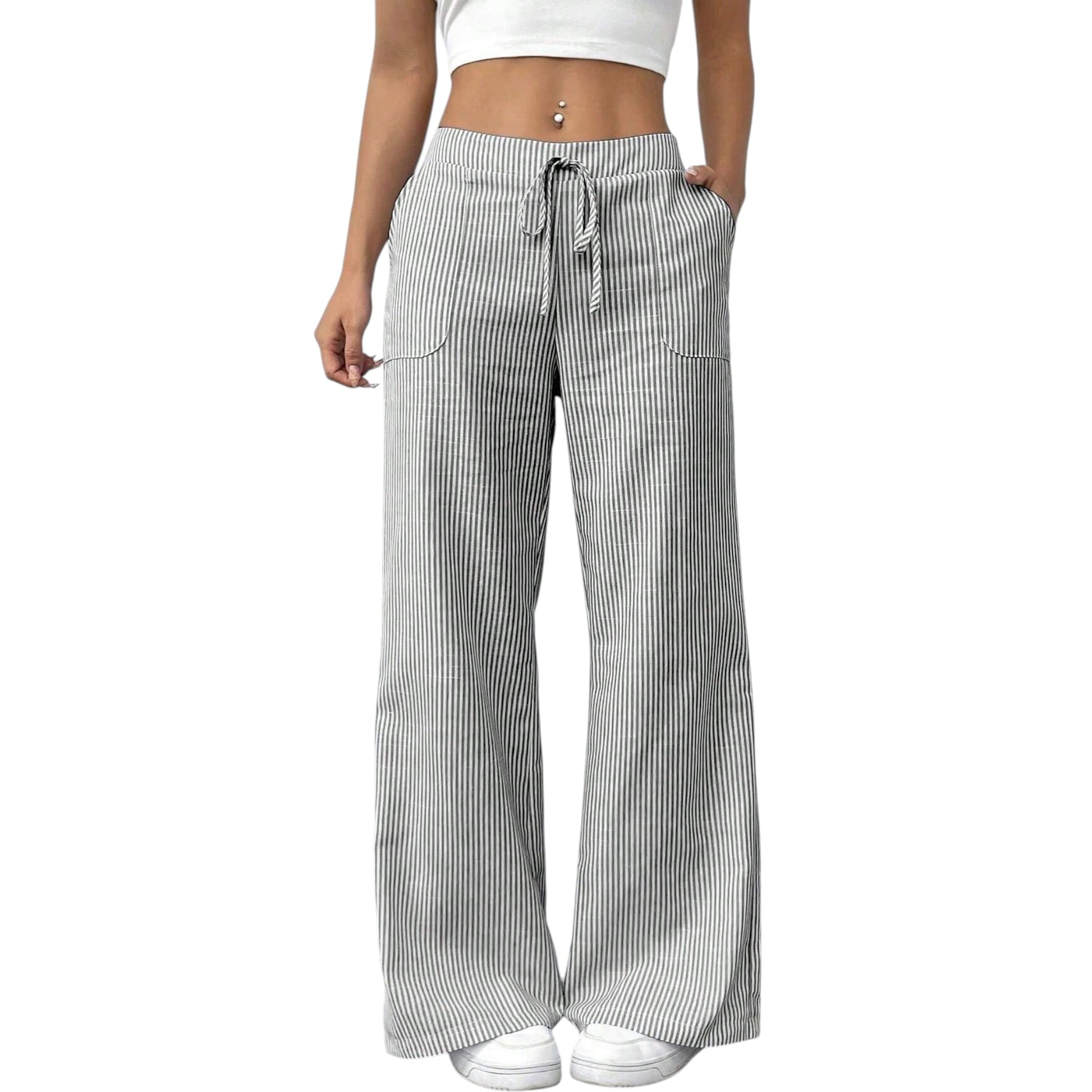 Címke nélküli, szürke-fehér, csíkos, megkötős, bő szárú nadrág.