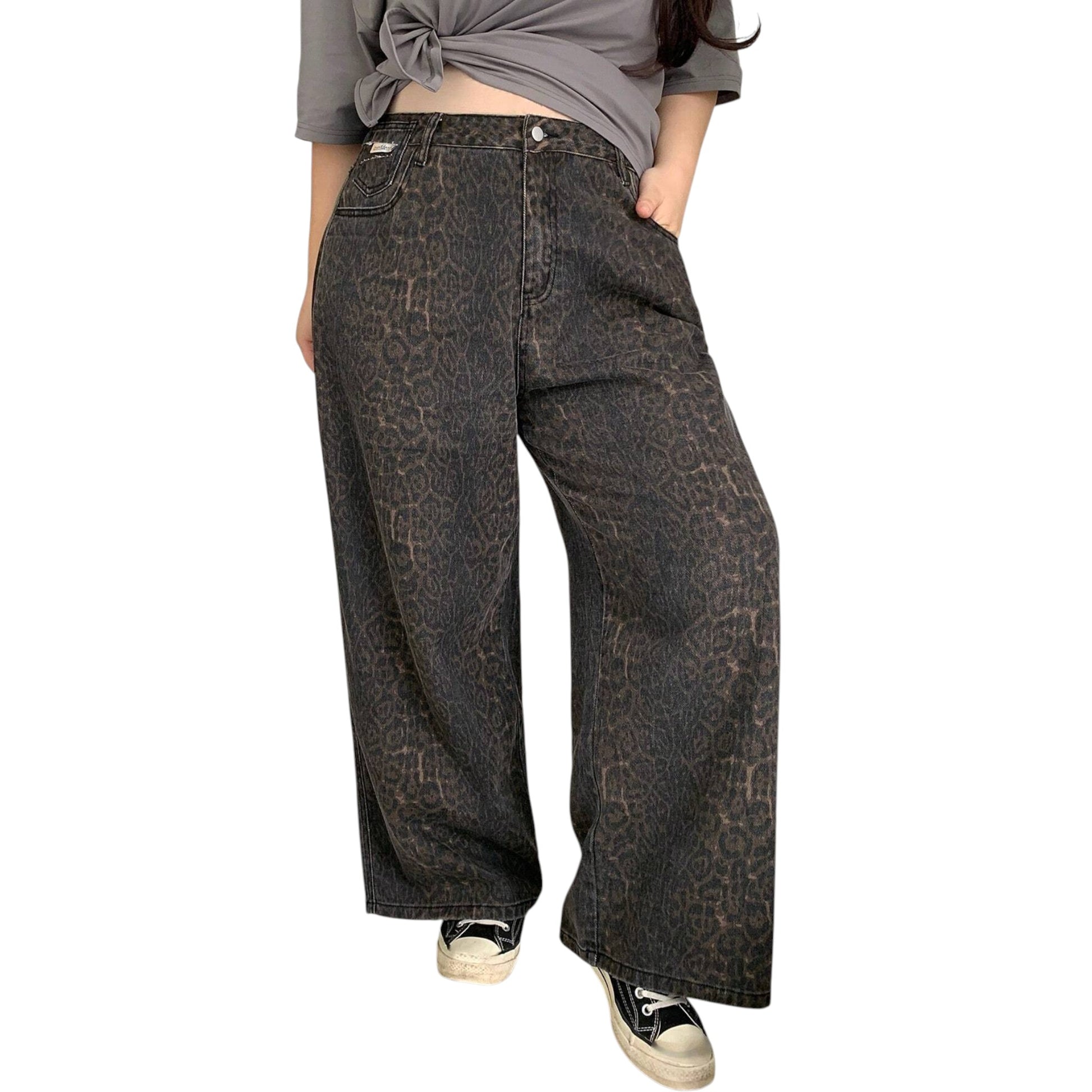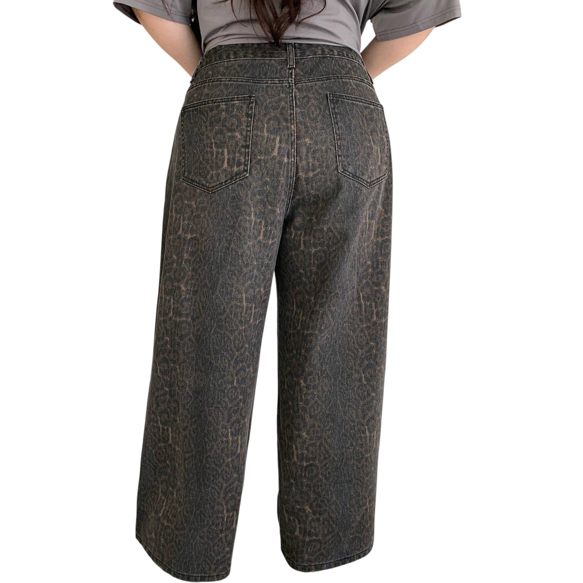 Címke nélküli, barna, leopárd mintás, magas derekú, széles szárú farmer nadrág.