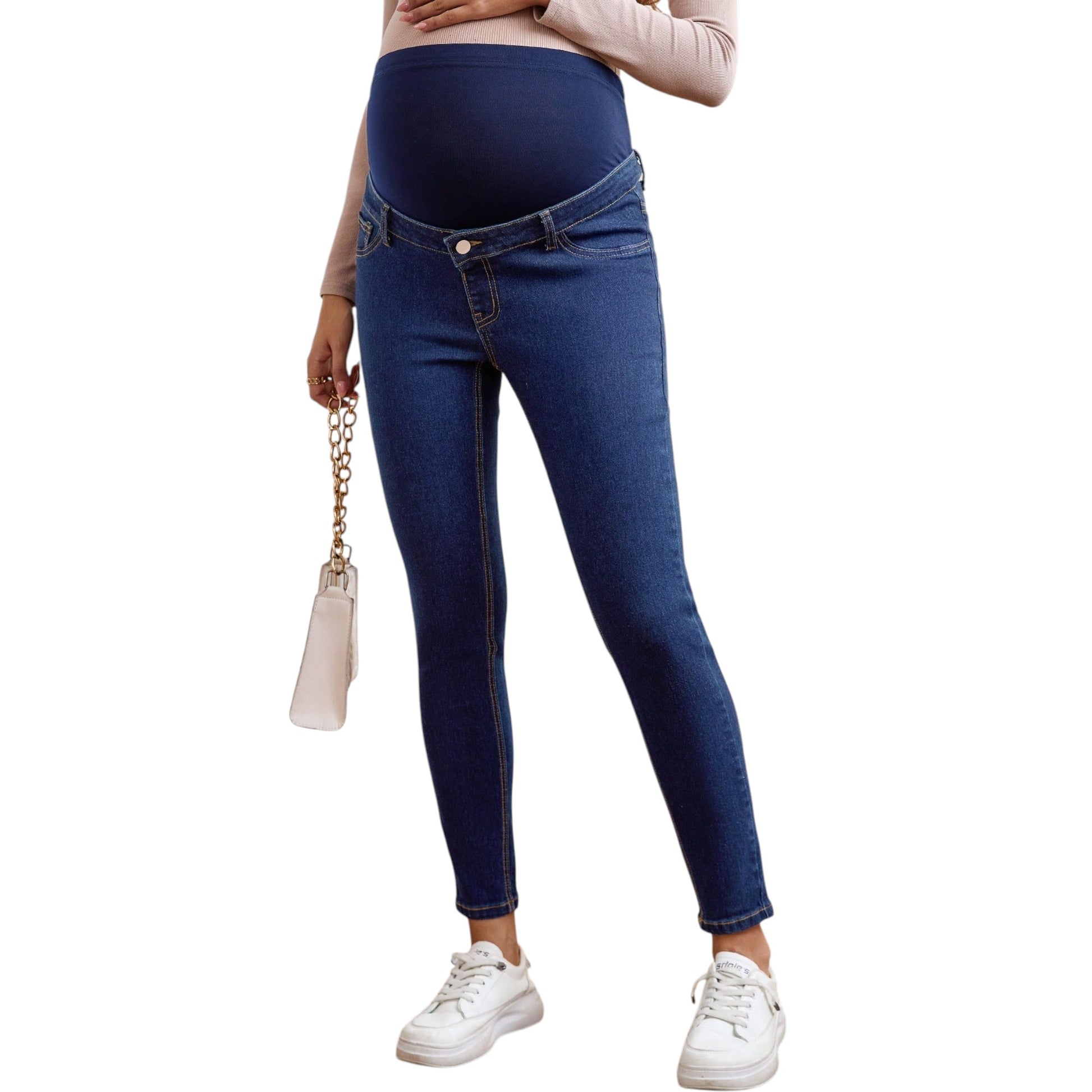 Címke nélküli, kék, slim fit, kismama farmer, sötétkék betéttel a pocaknál.