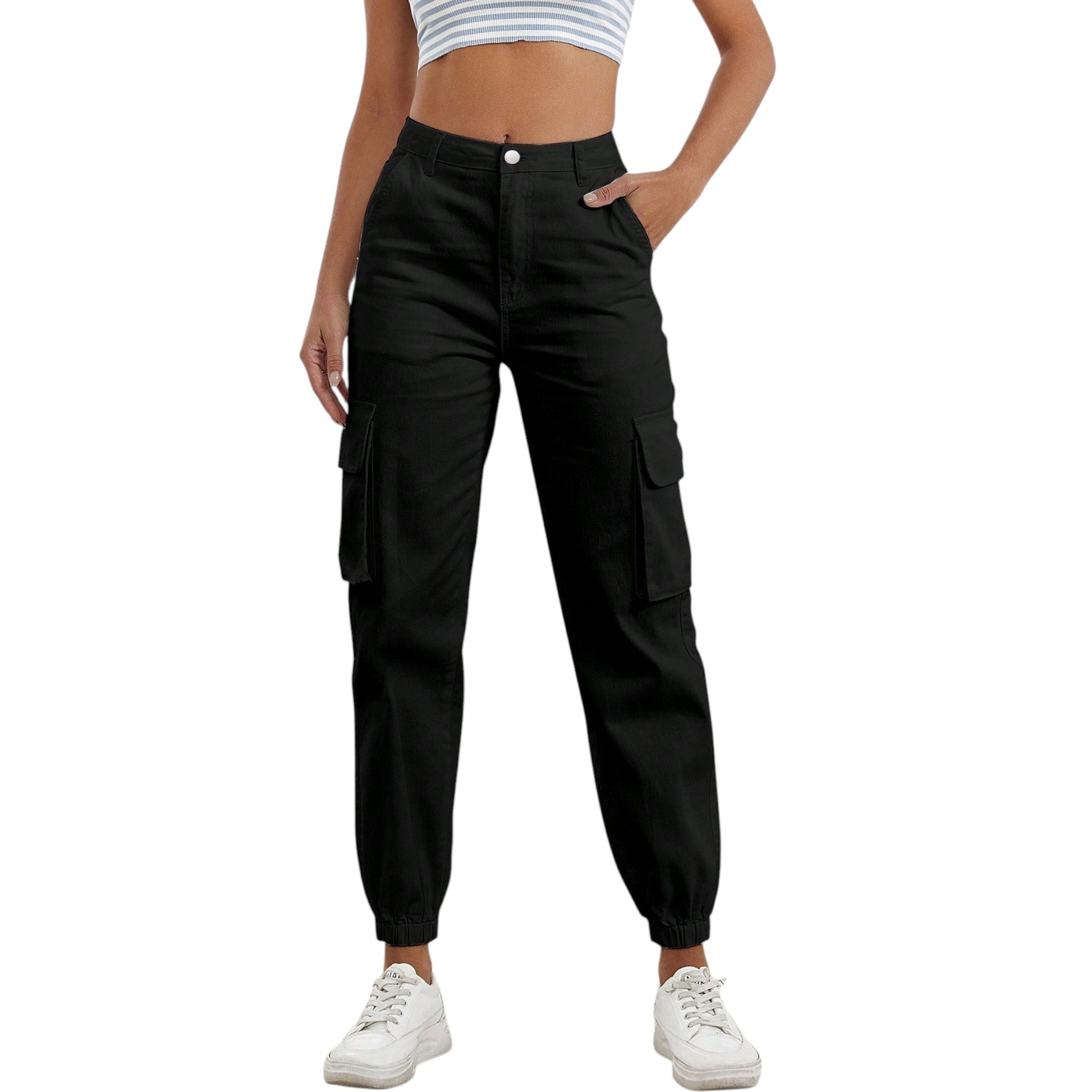Címke nélküli, fekete, gumis derekú és gumis bokájú, cargo stílusú nadrág.