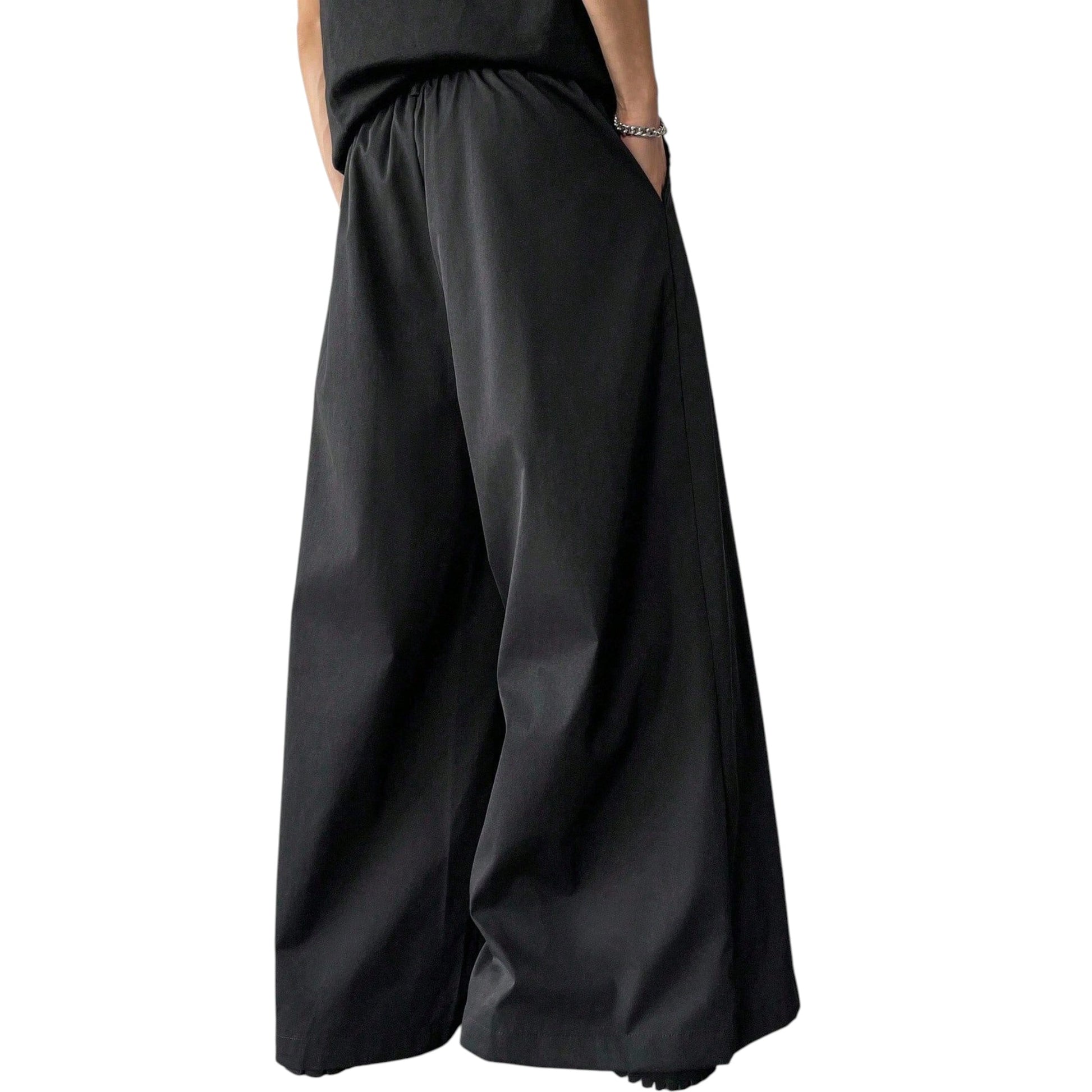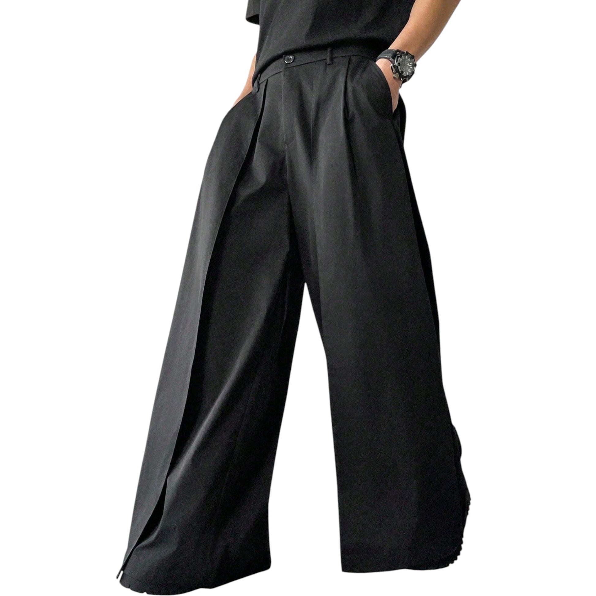 Címke nélküli, fekete, széles szárú, hasított, gombos és cipzáras záródású nadrág.