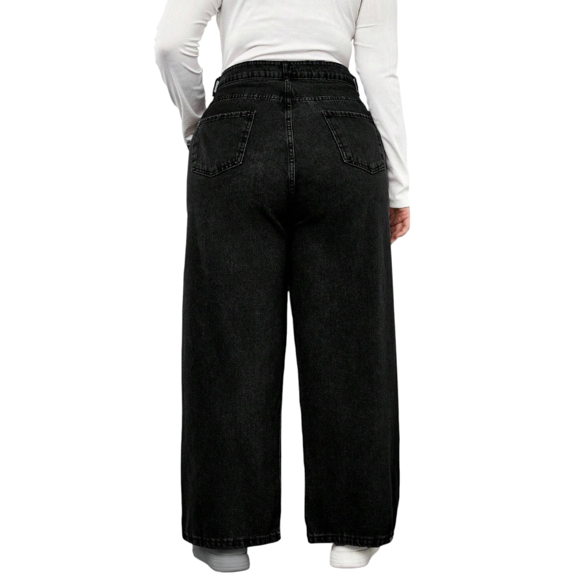 Címke nélküli, fekete, magas derekú, bő szárú farmer nadrág.