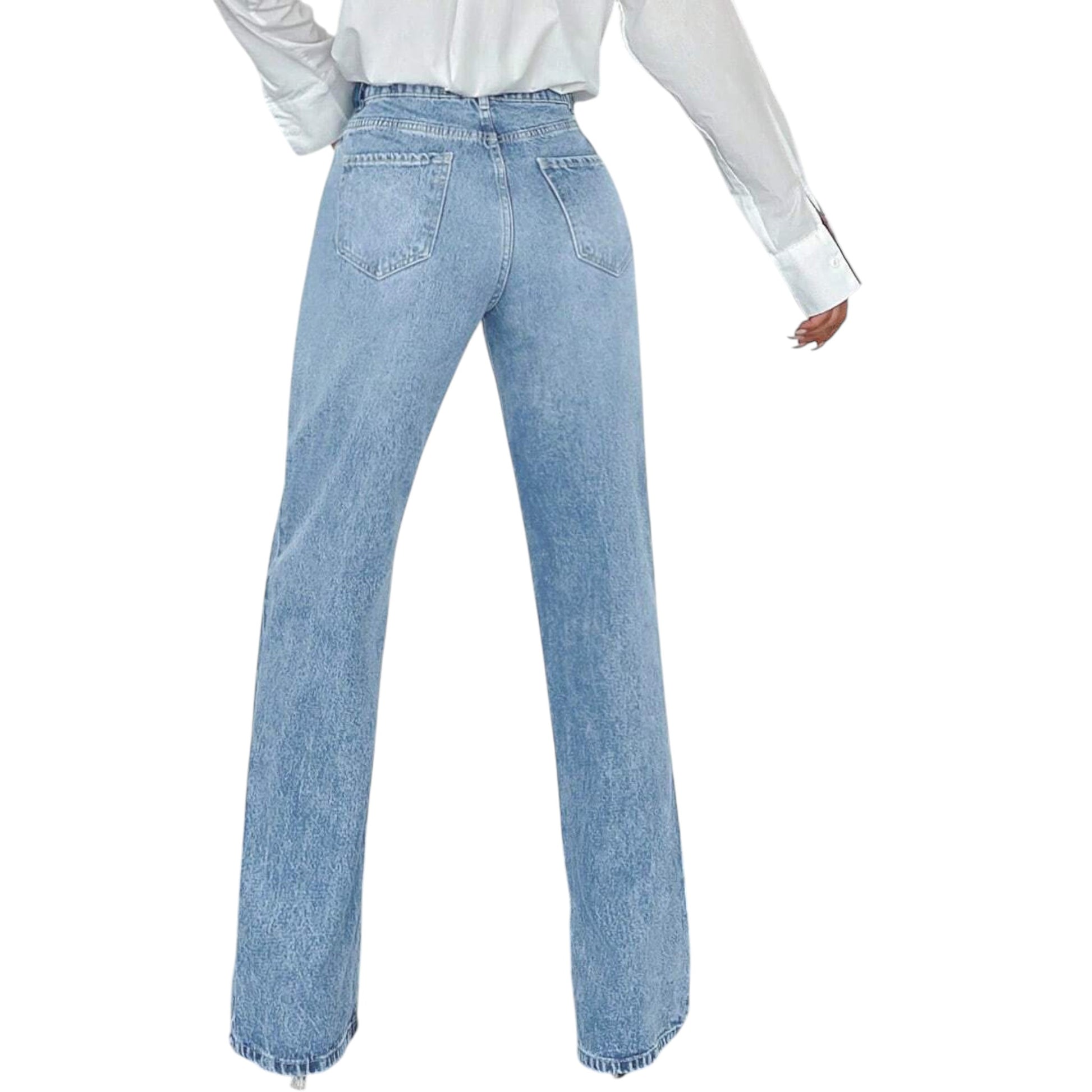 Címke nélküli, világoskék, magas derekú, egyenes szárú, alján felvágott farmer nadrág.