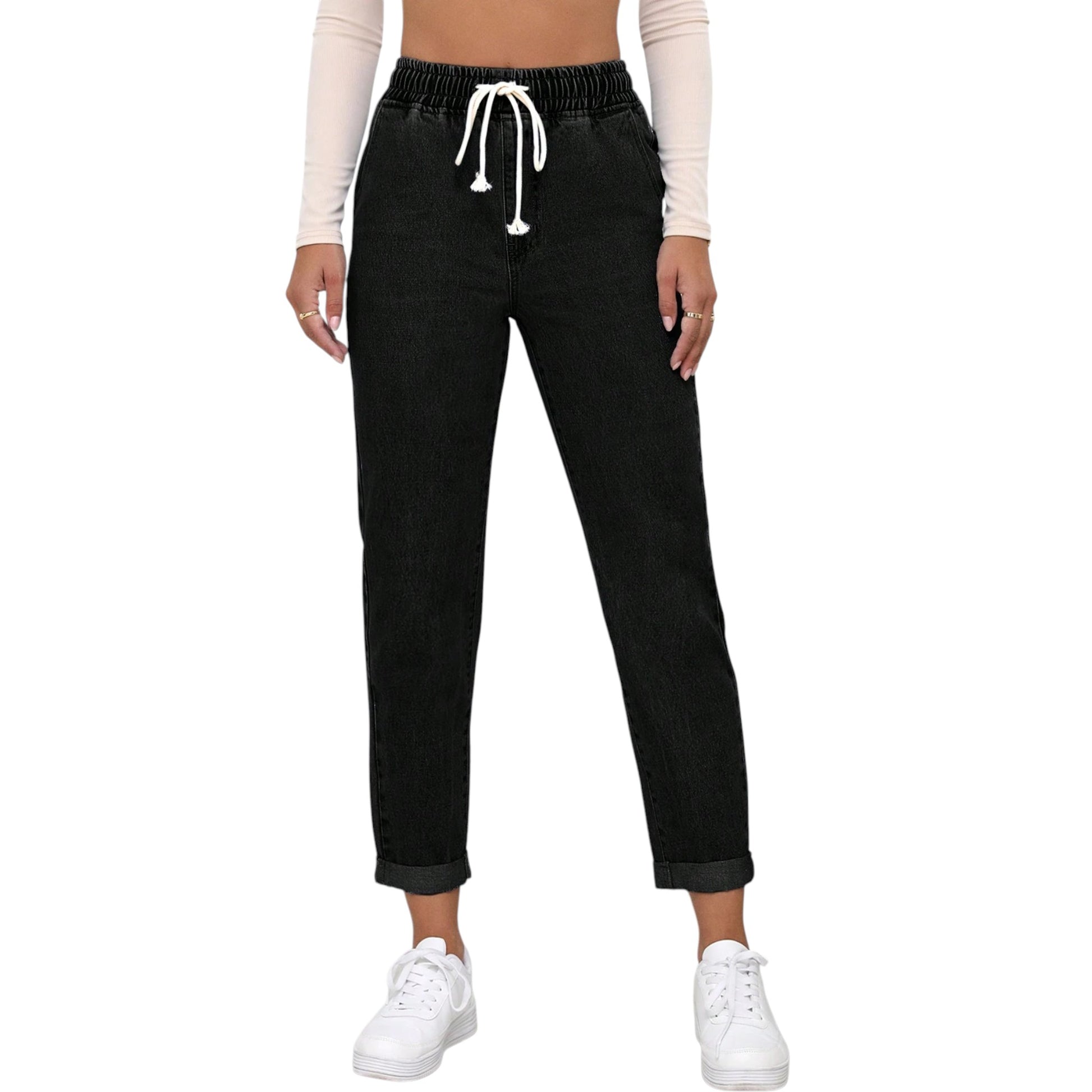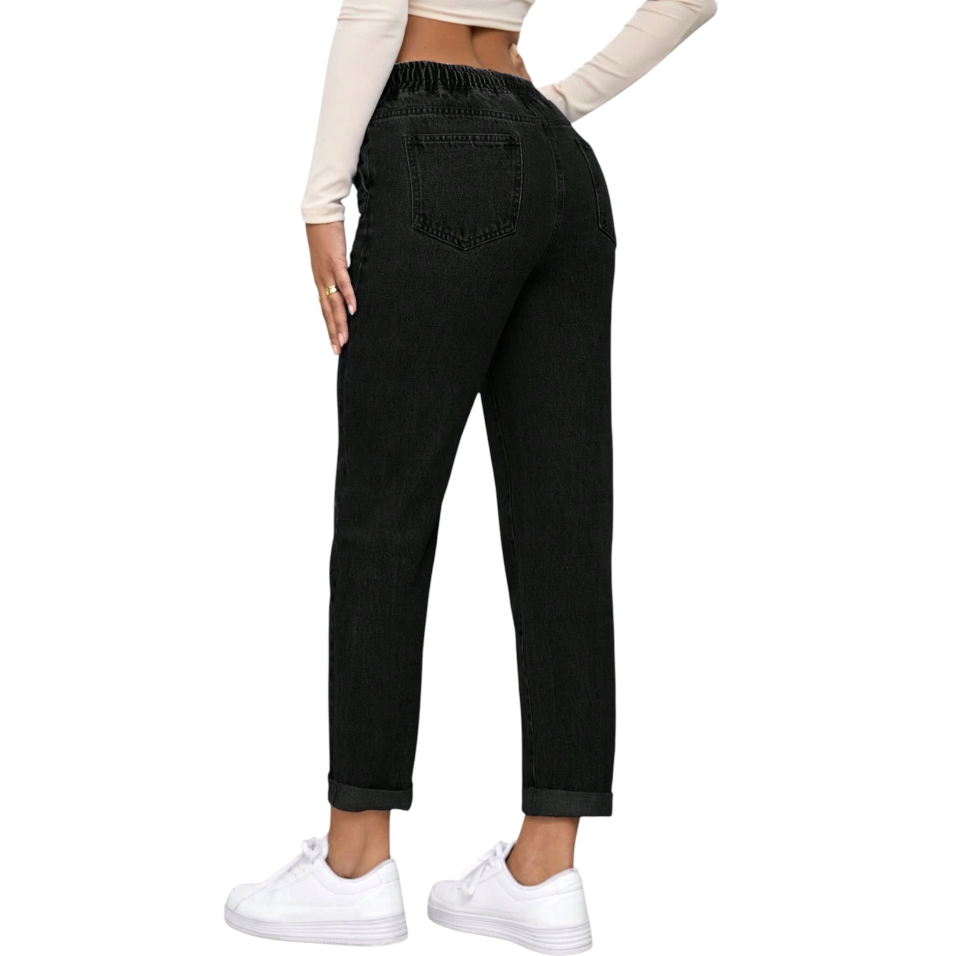 Címke nélküli, fekete, zsinóros, gumis derekú, felhajtott szárú, farmer nadrág.