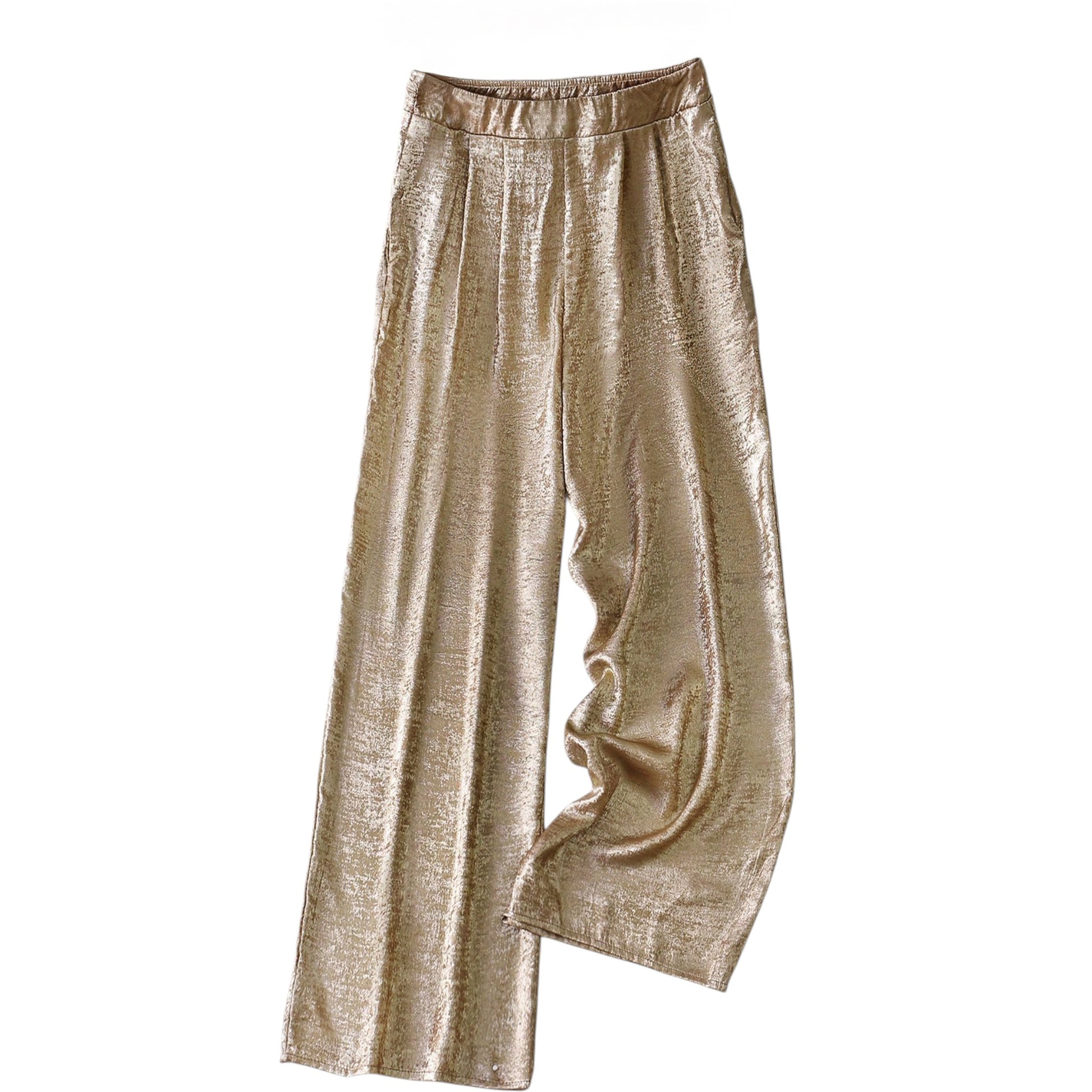 Címke nélküli, arany, magas derekú, bő szárú nadrág, enyhén metálfényű felülettel.
