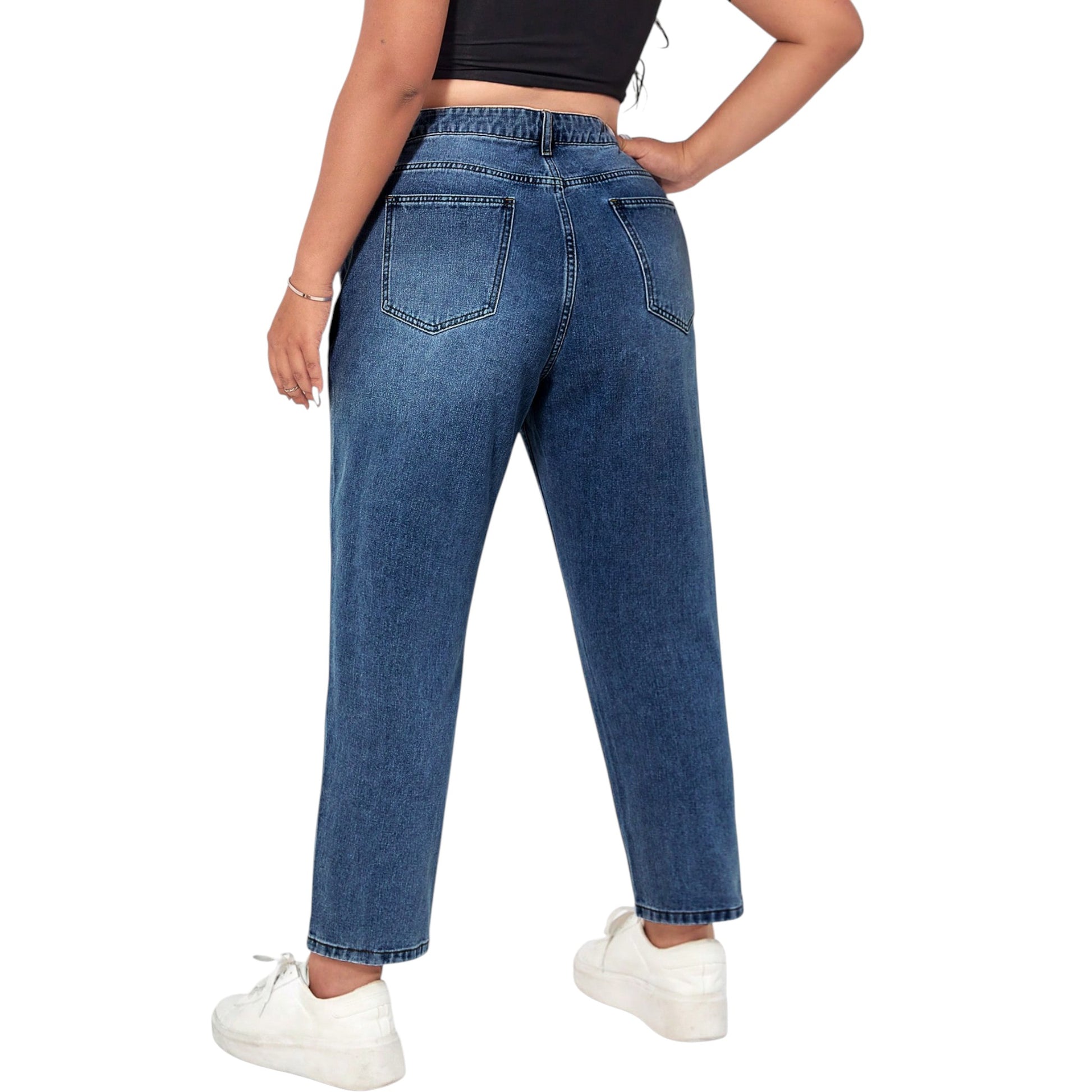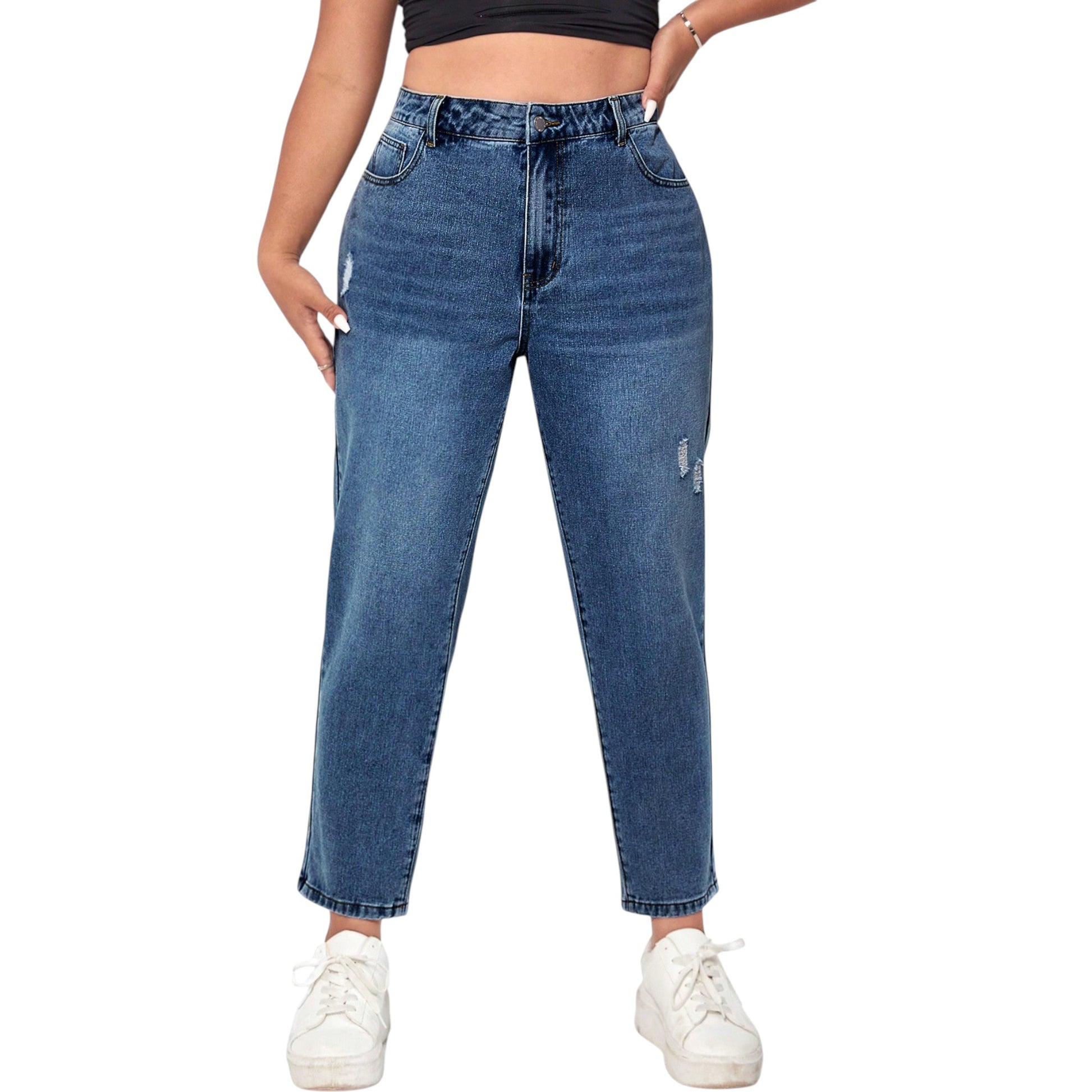 Címke nélküli, kék, szaggatott, magas derekú, egyenes szárú farmer nadrág.