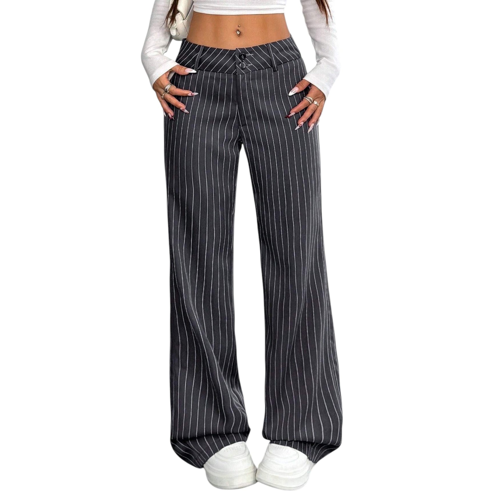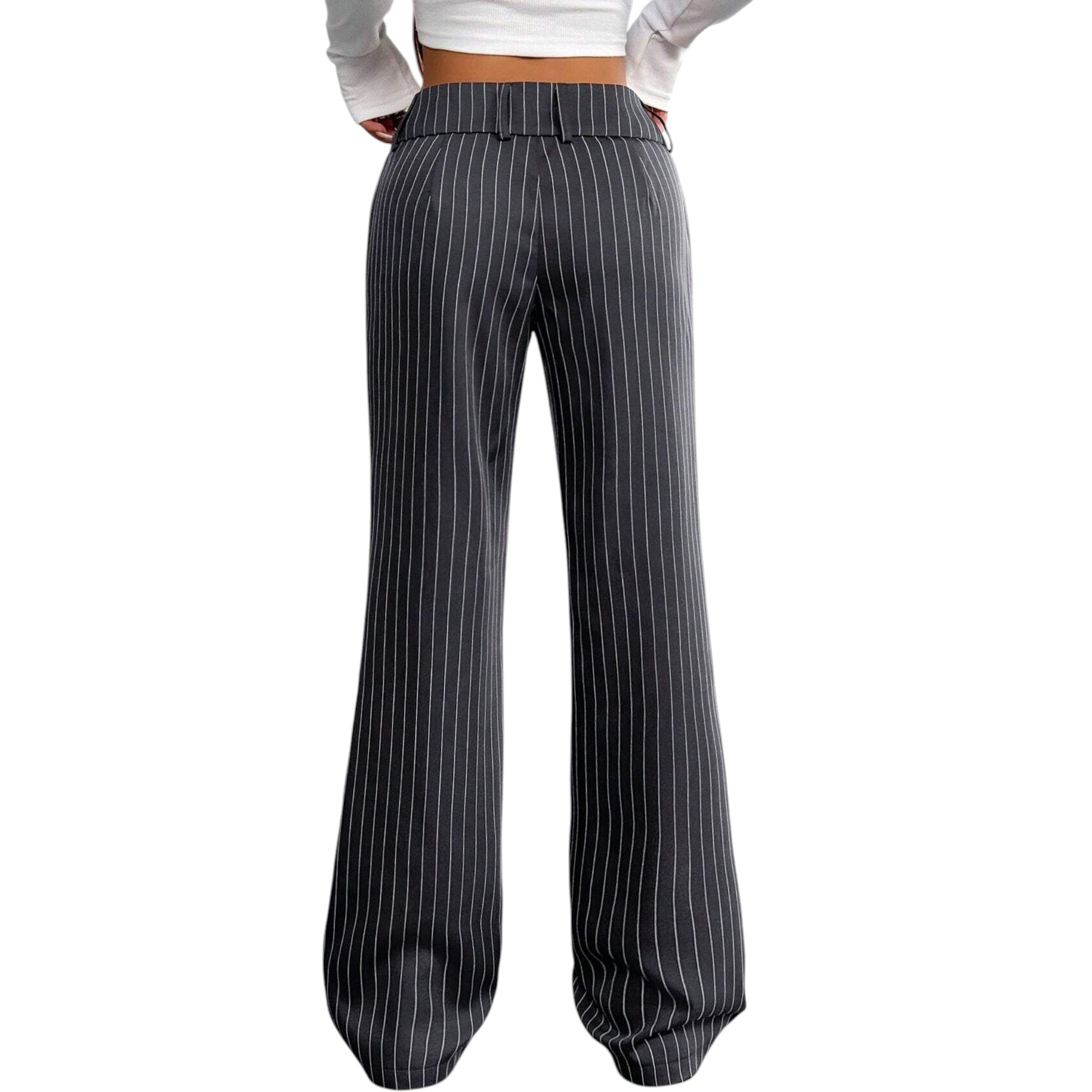 Címke nélküli, szürke, fehér vékony függőleges csíkos, magas derekú, gombos, bő szárú nadrág.
