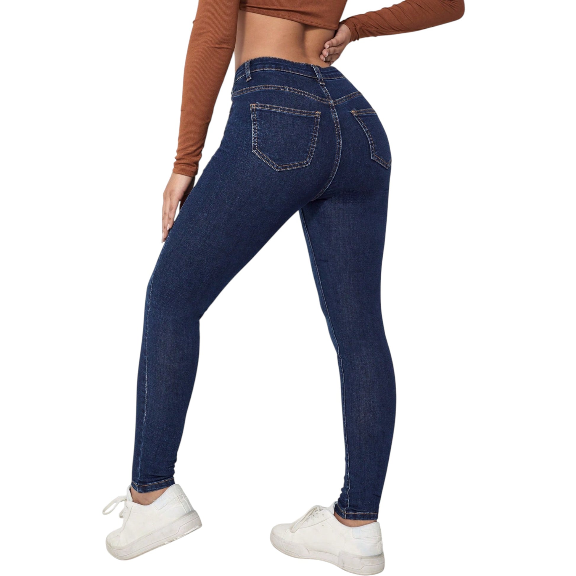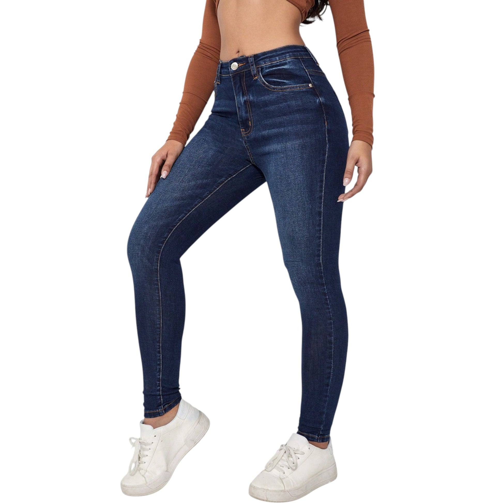 Címke nélküli, sötétkék, magas derekú, slim fit farmer nadrág.