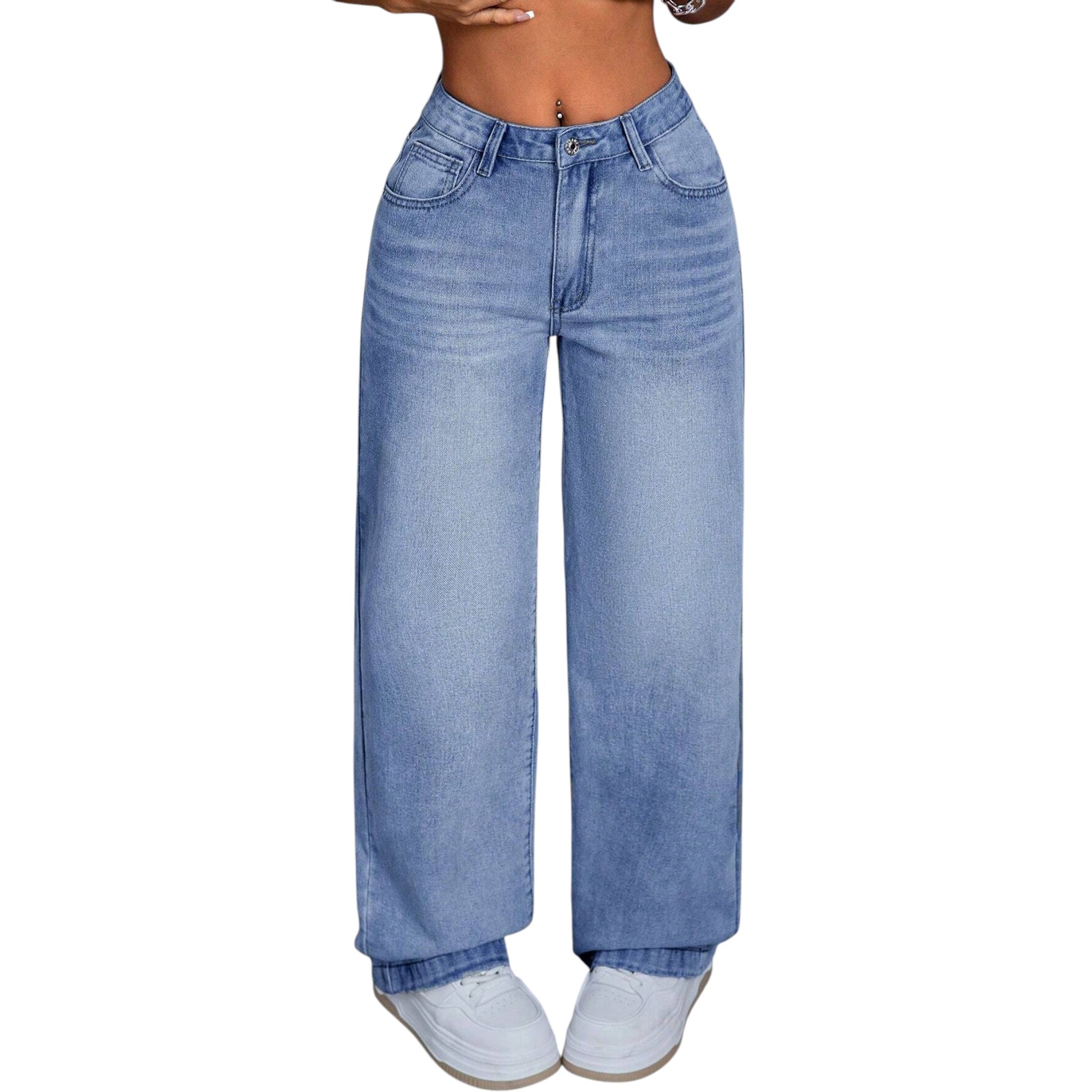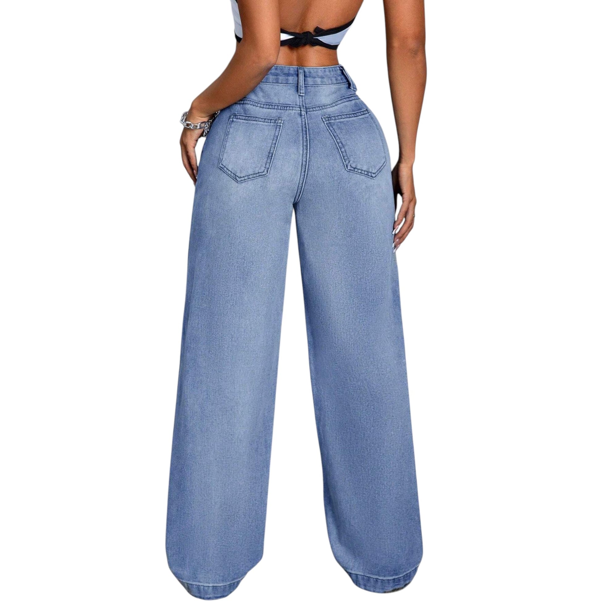 Címke nélküli, kék, világos farmer, magas derekú, széles szárú, egyenes szabású farmer nadrág.