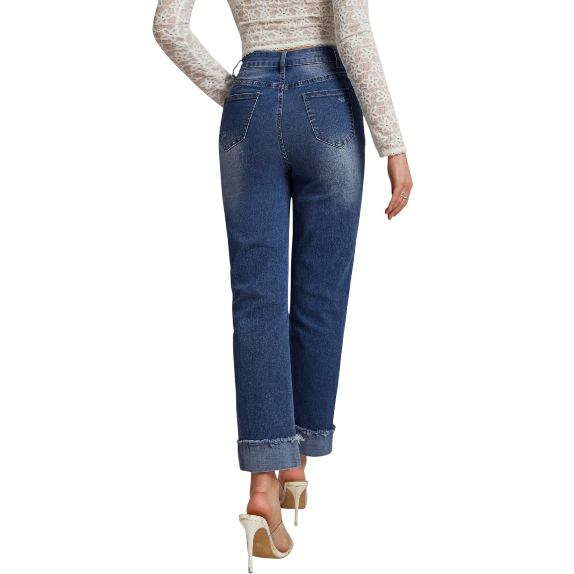 Címke nélküli, kék, szaggatott, felhajtott szárú, magas derekú farmer.