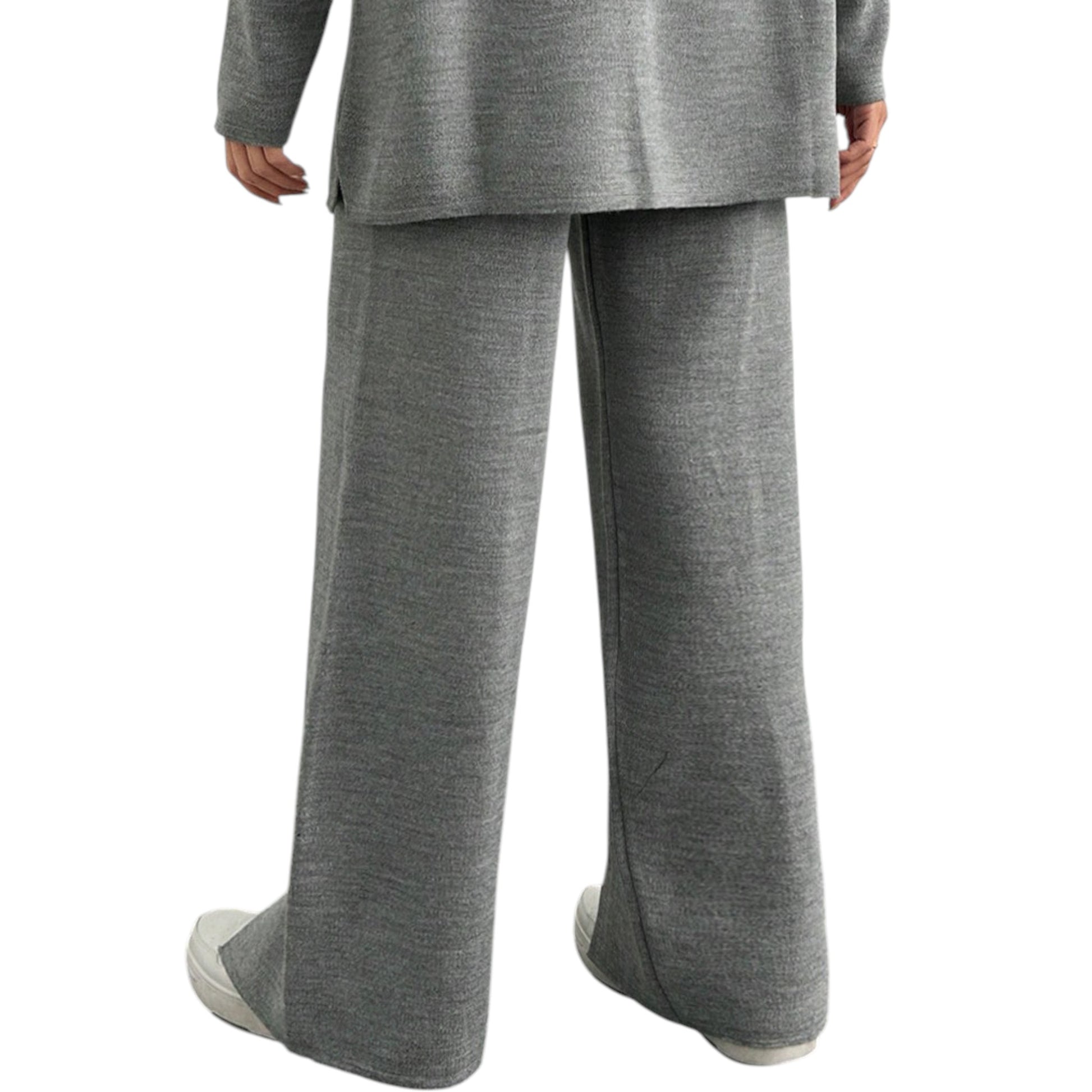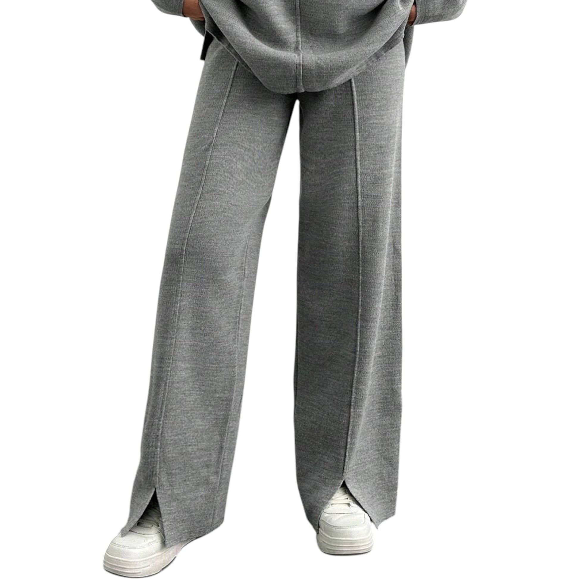 Címke nélküli, szürke, kötött anyag, széles szárú, elöl felhasított aljjal.