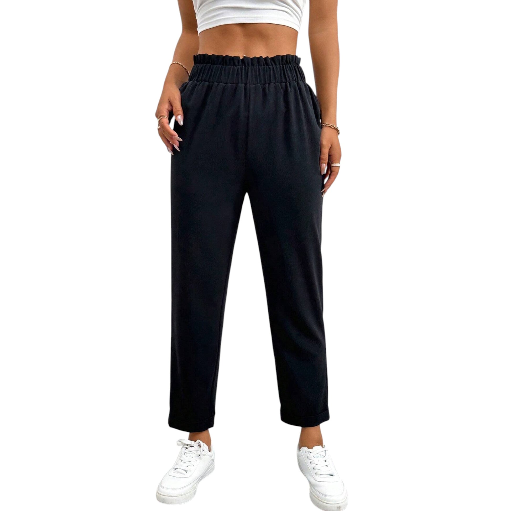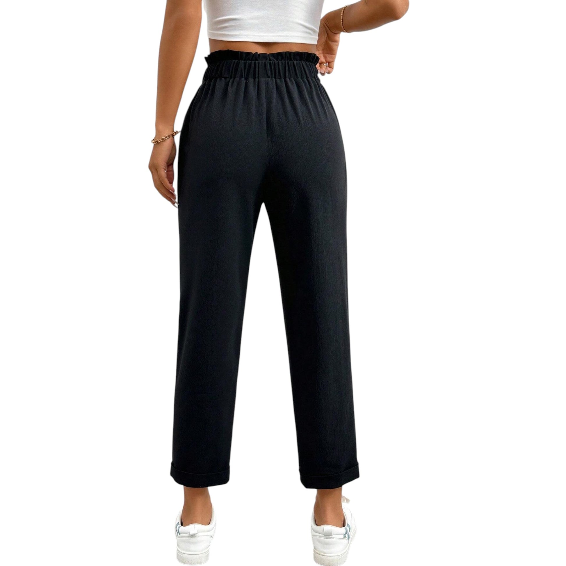 Címke nélküli, fekete, magas, ráncolt derekú, enyhén bő szárú, passzés nadrág.