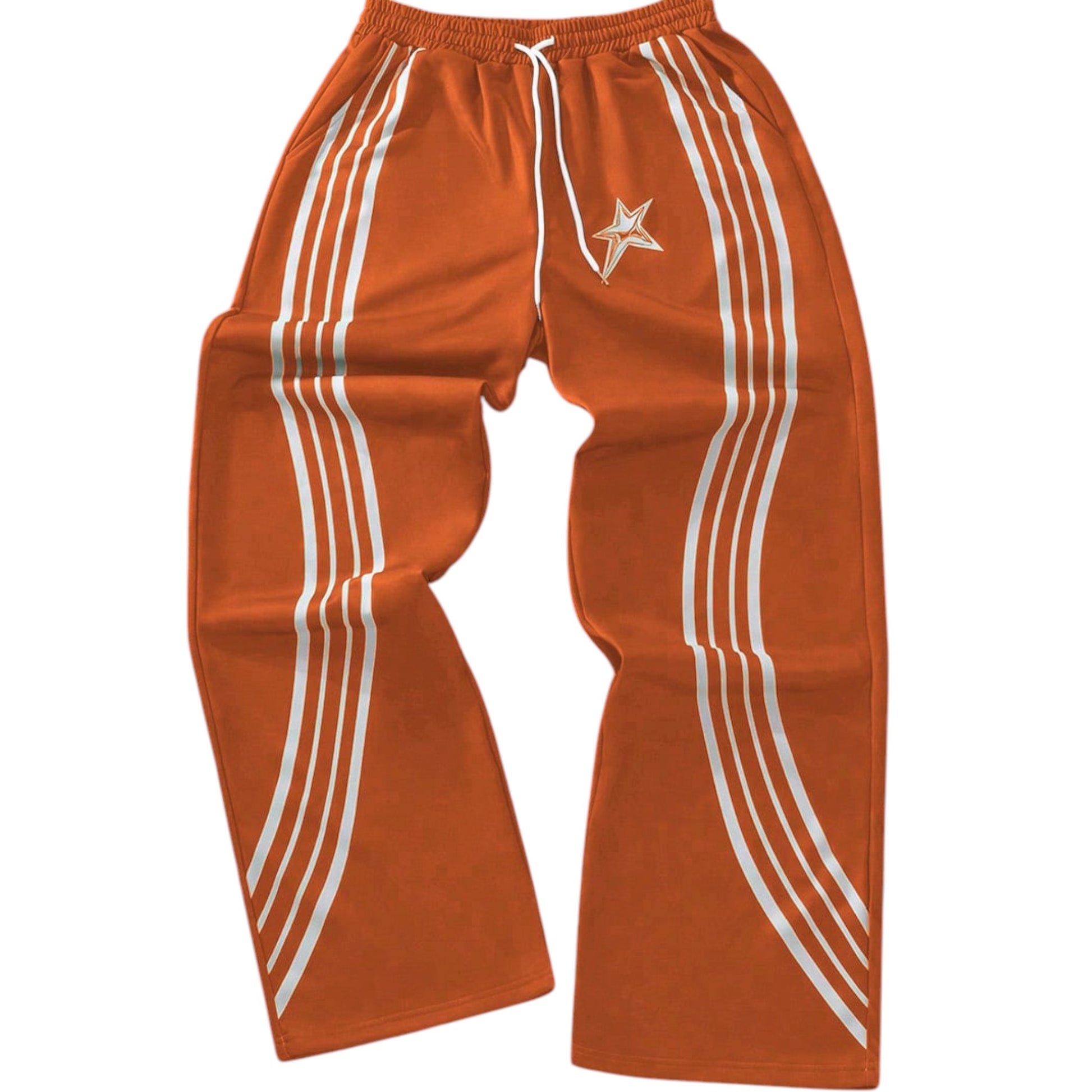 Címke nélküli, narancssárga, gumis és madzagos derekú, széles szárú melegítő nadrág fehér csíkokkal és egy csillaggal.
