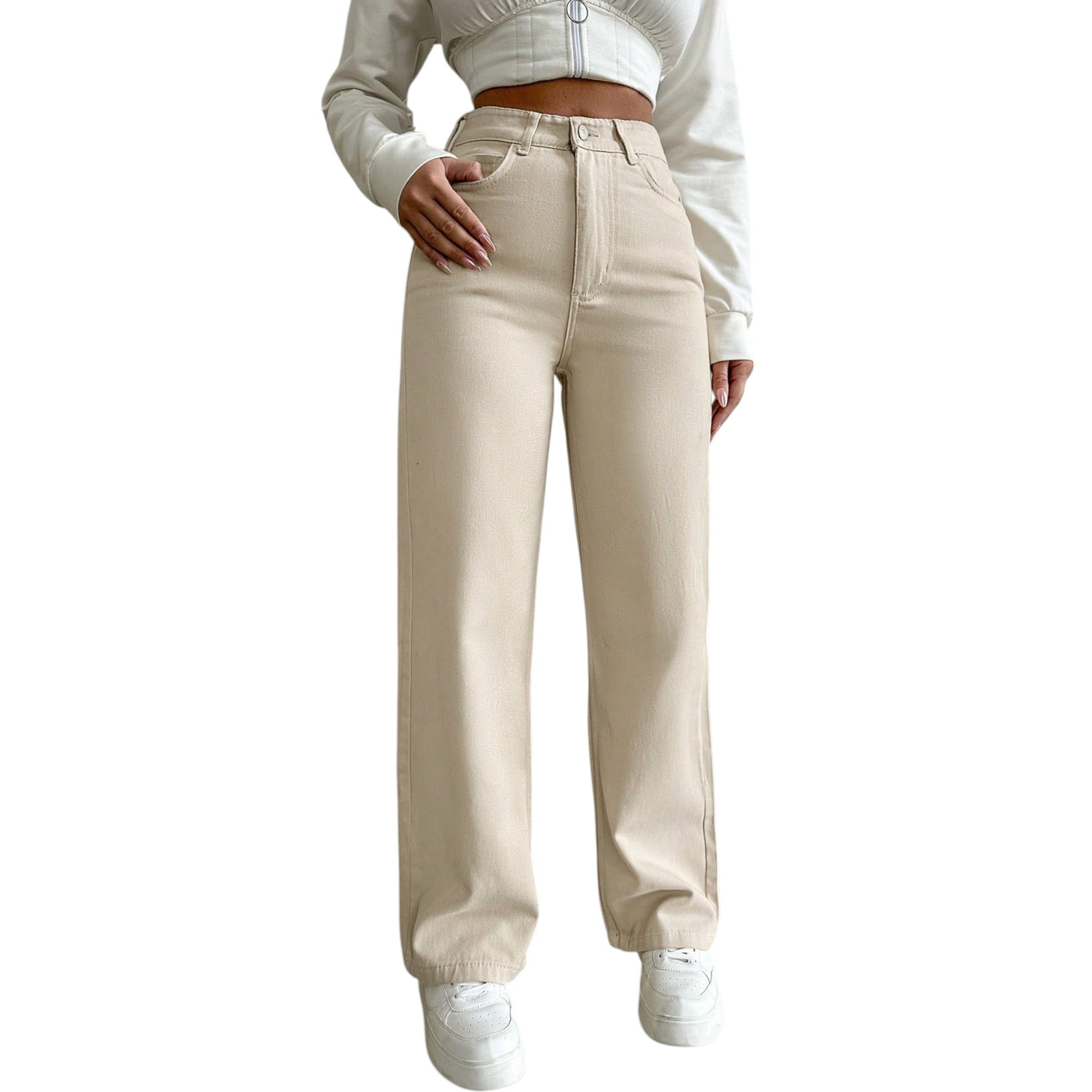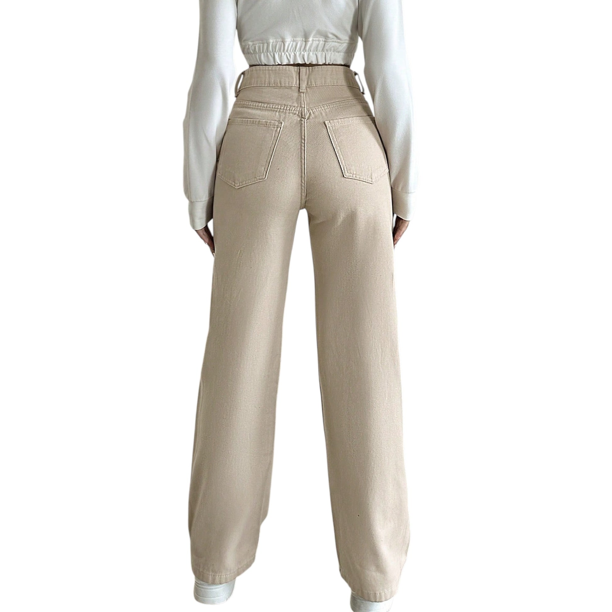Címke nélküli, bézs, magas derekú, egyenes szárú farmer nadrág.