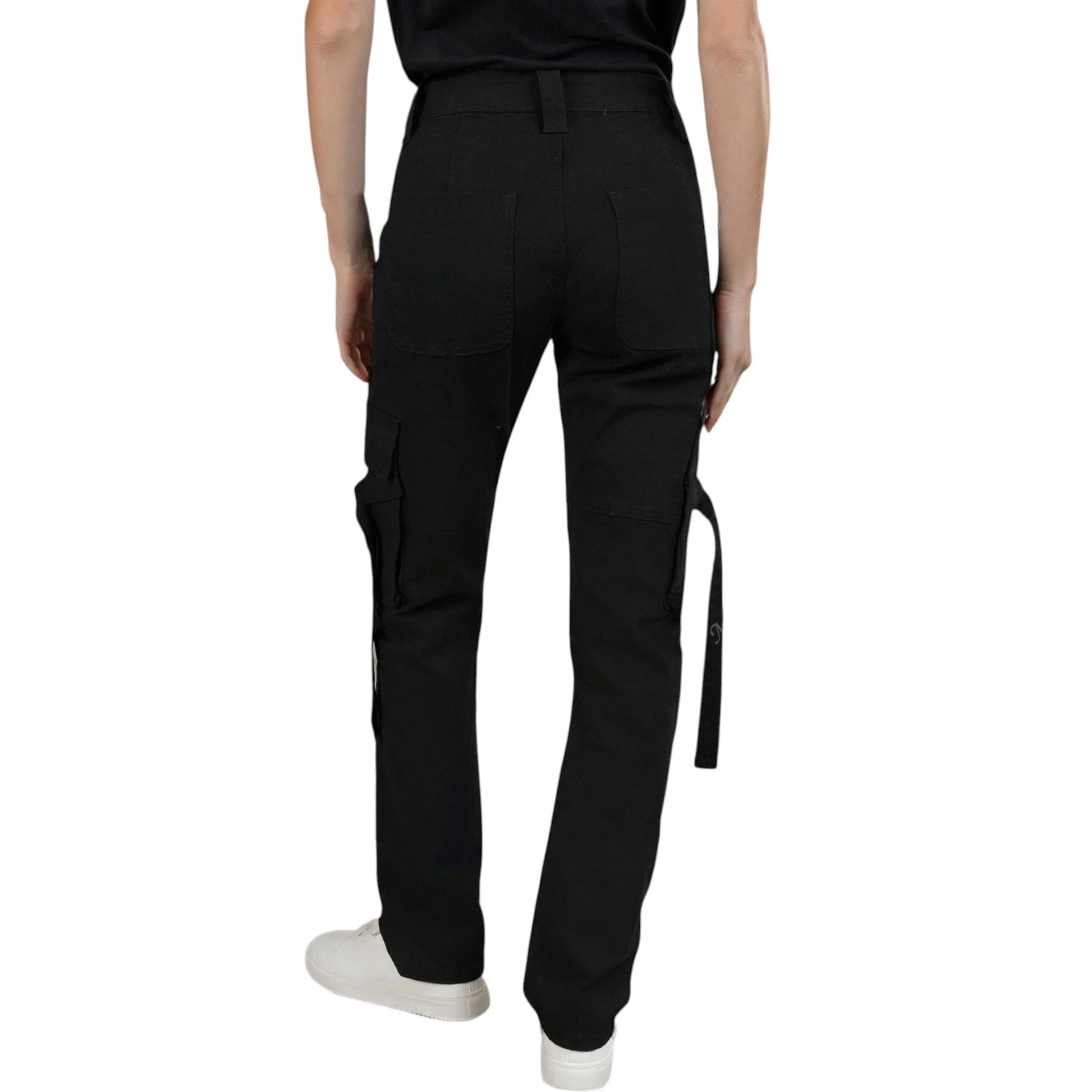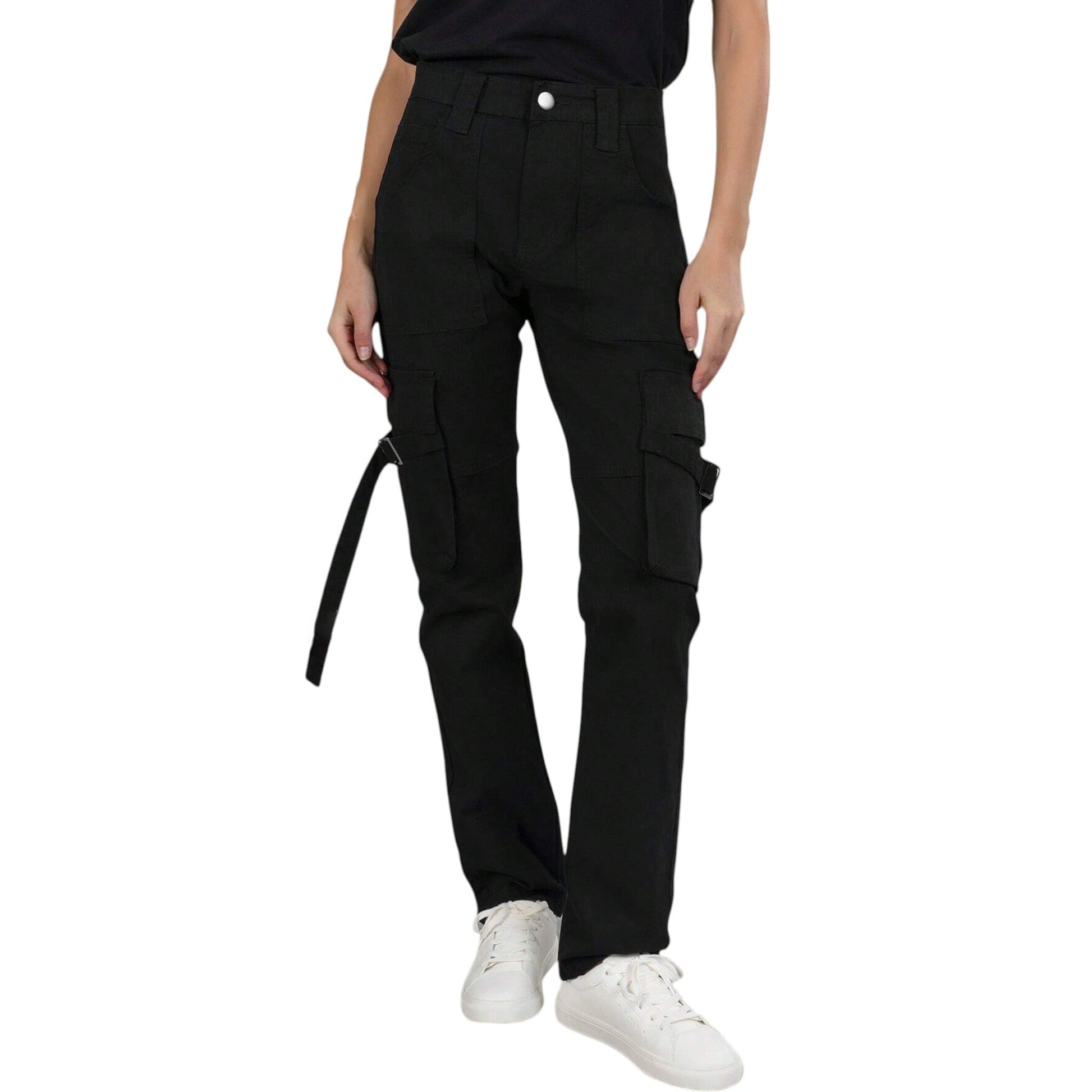 Címke nélküli, fekete, magas derekú cargo nadrág, oldalt zsebekkel és pántos díszítéssel.