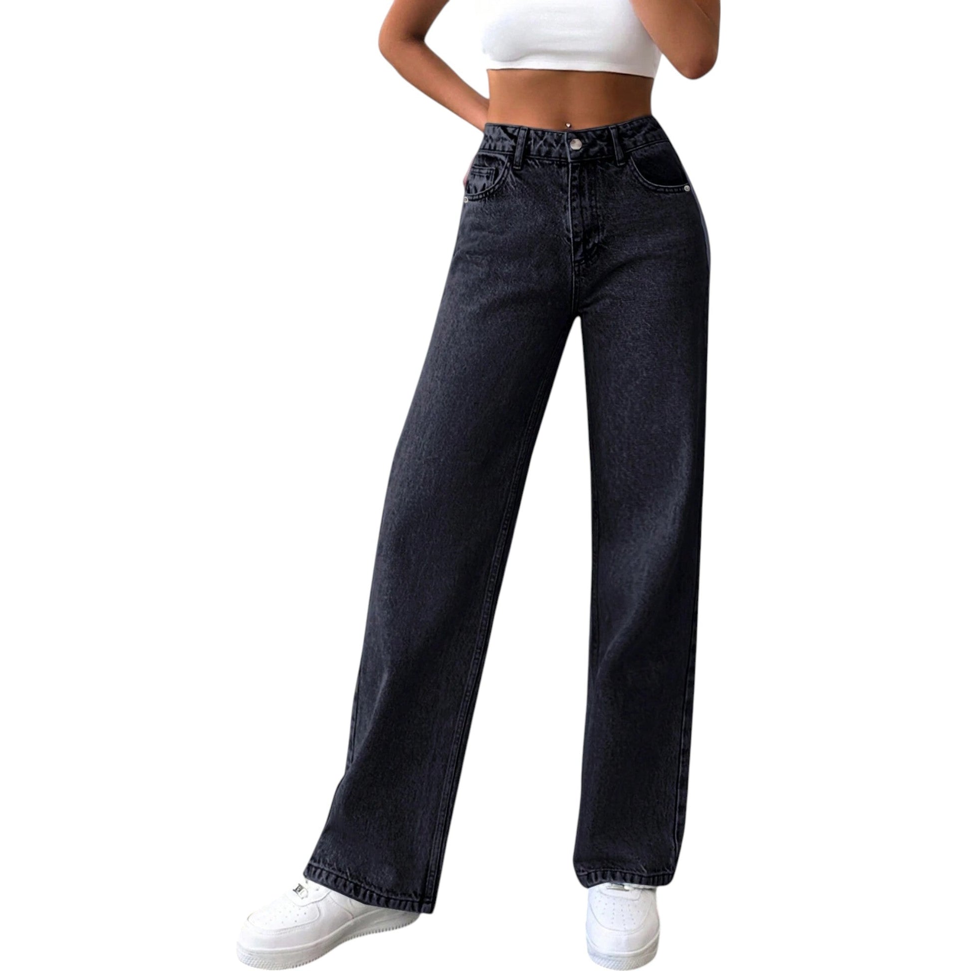 Címke nélküli, fekete, egyenes szárú farmer nadrág. Magas derekú, gombos és cipzáras záródású, övtartókkal. Ötzsebes kialakítás, enyhén koptatott hatású.