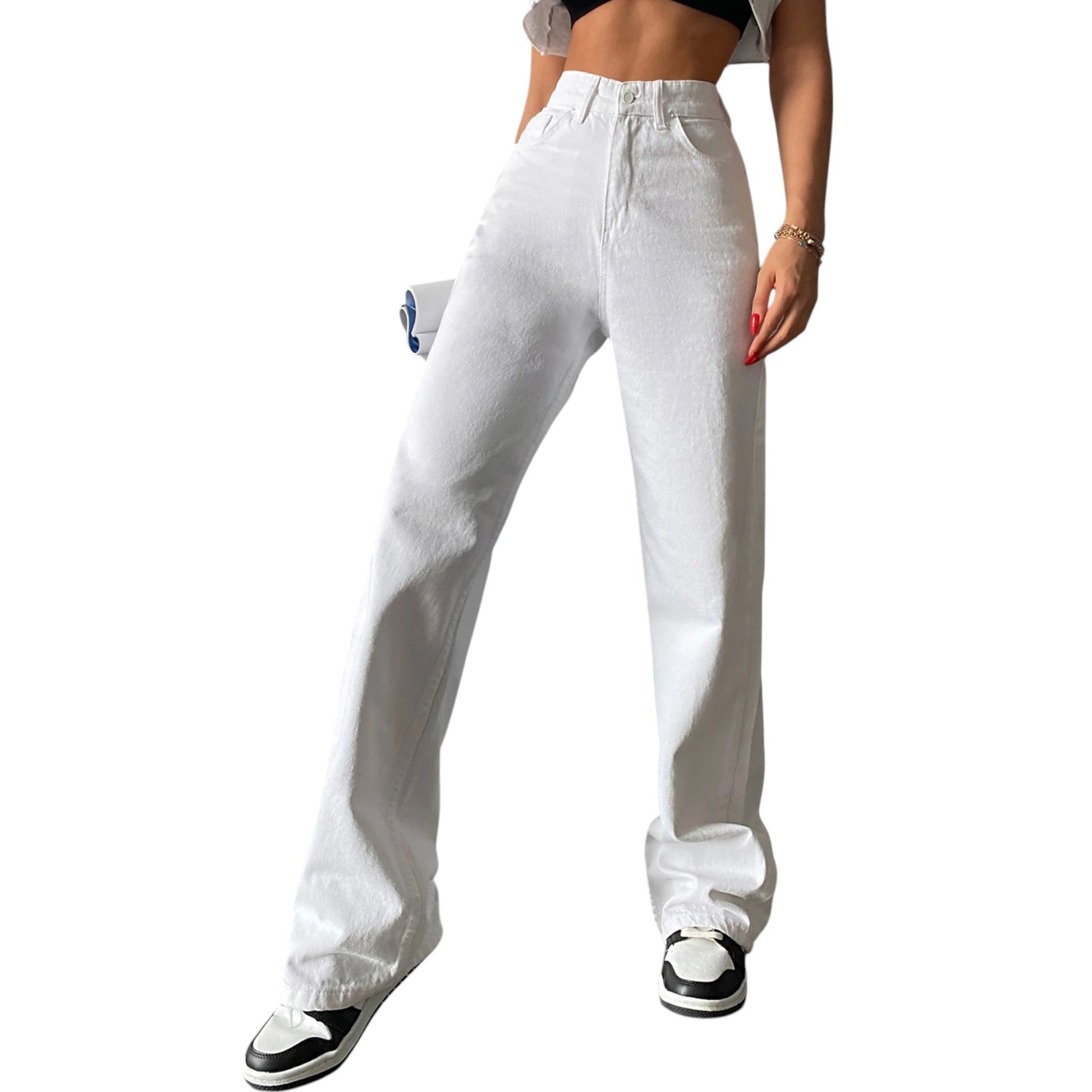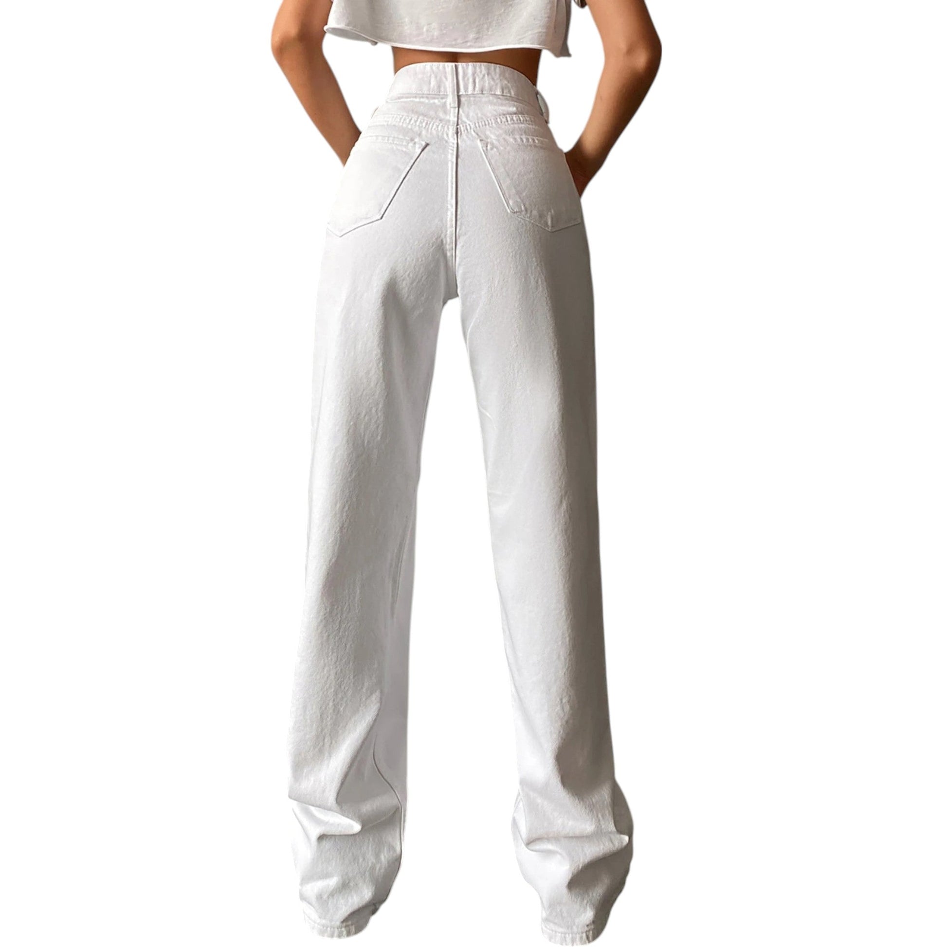 Címke nélküli, fehér, magas derekú egyenes szárú farmer nadrág. Ötzsebes kialakítású.