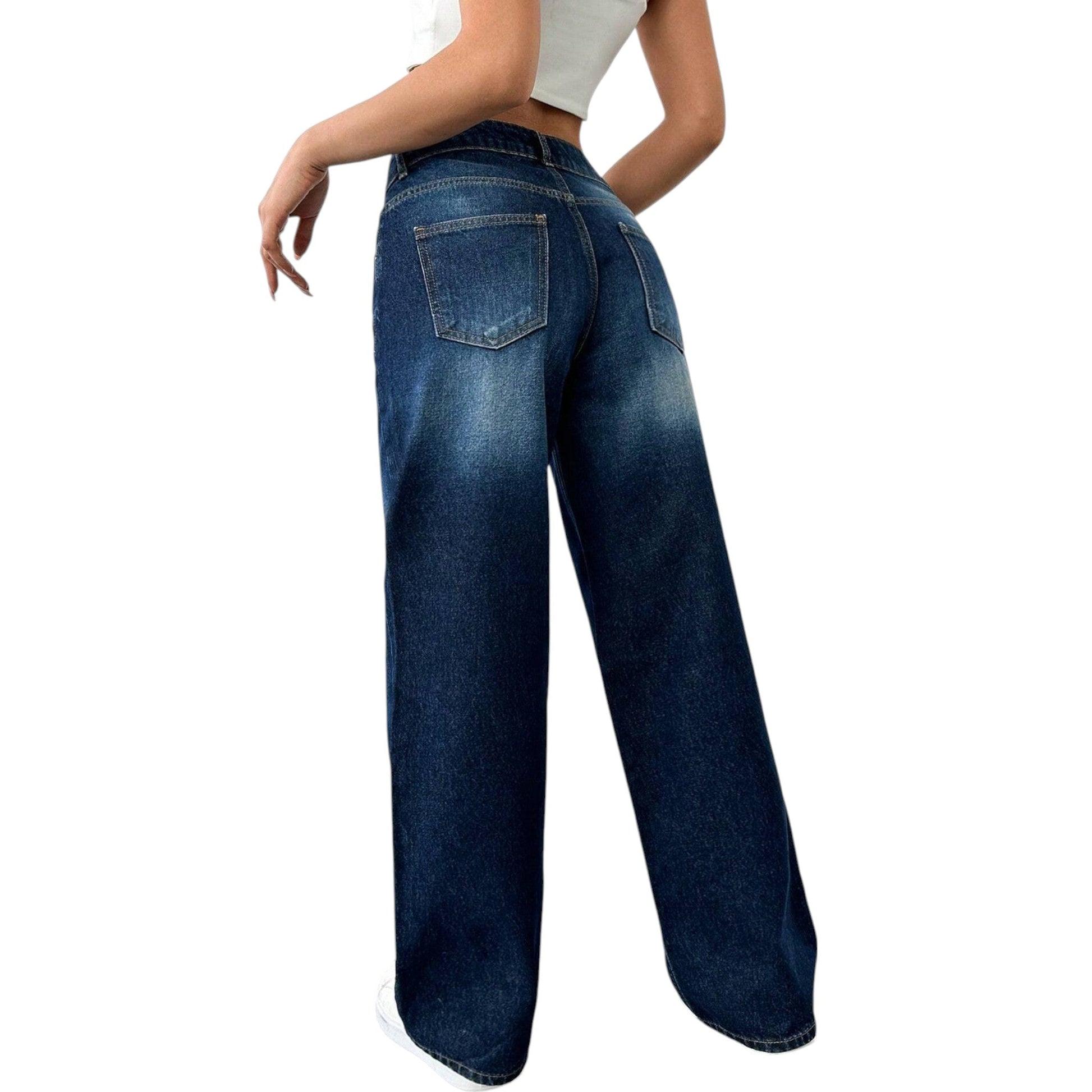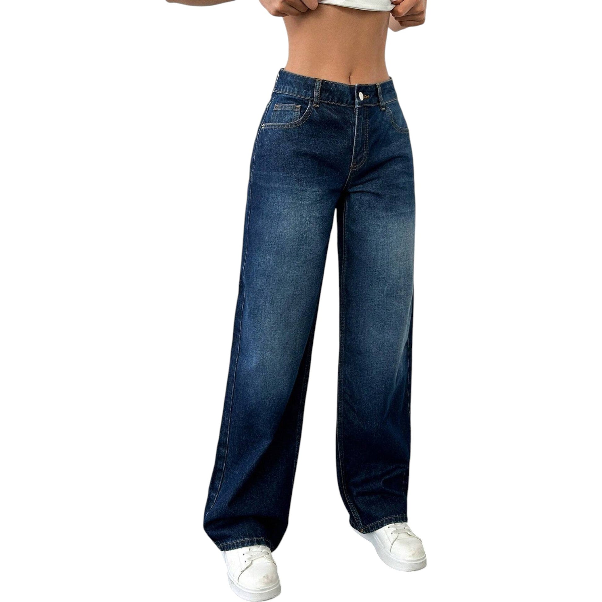 Címke nélküli, sötétkék, magas derekú, egyenes szárú farmer, zsebekkel, koptatott hatással.