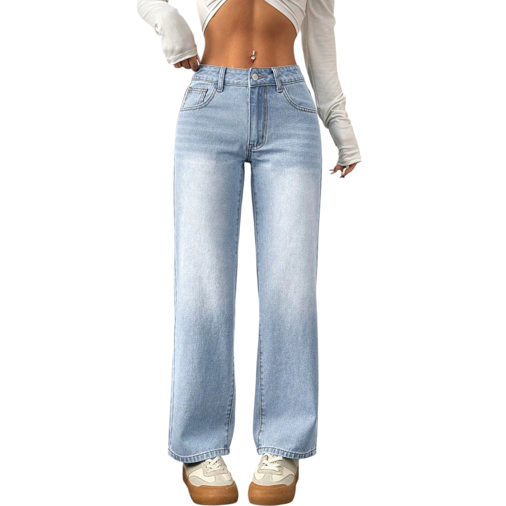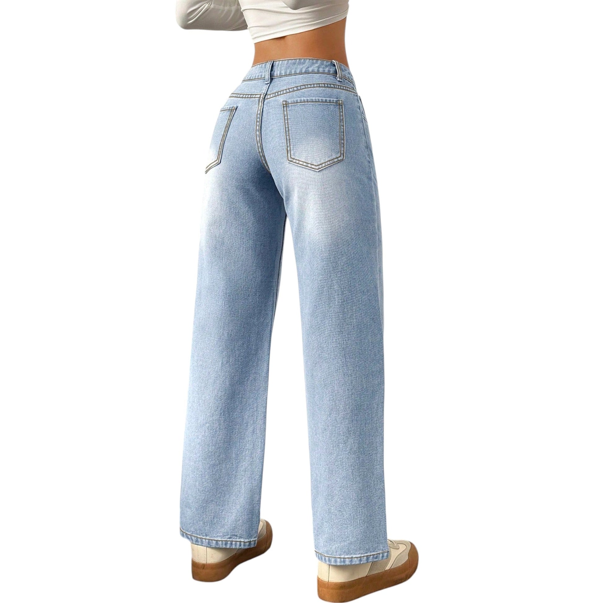 Címke nélküli, világoskék, magas derekú, wide leg farmer nadrág, zsebes, gombos és cipzáras záródású.