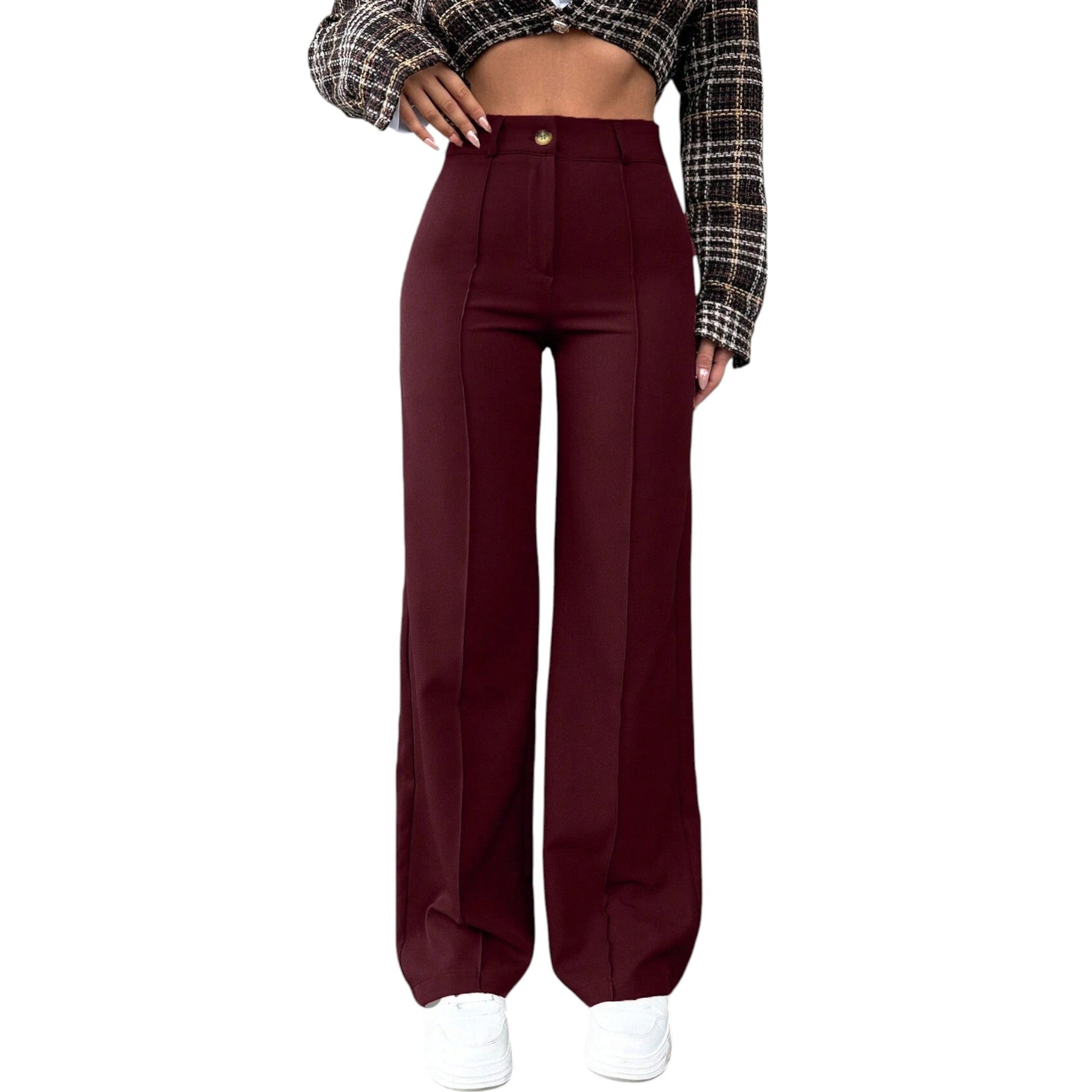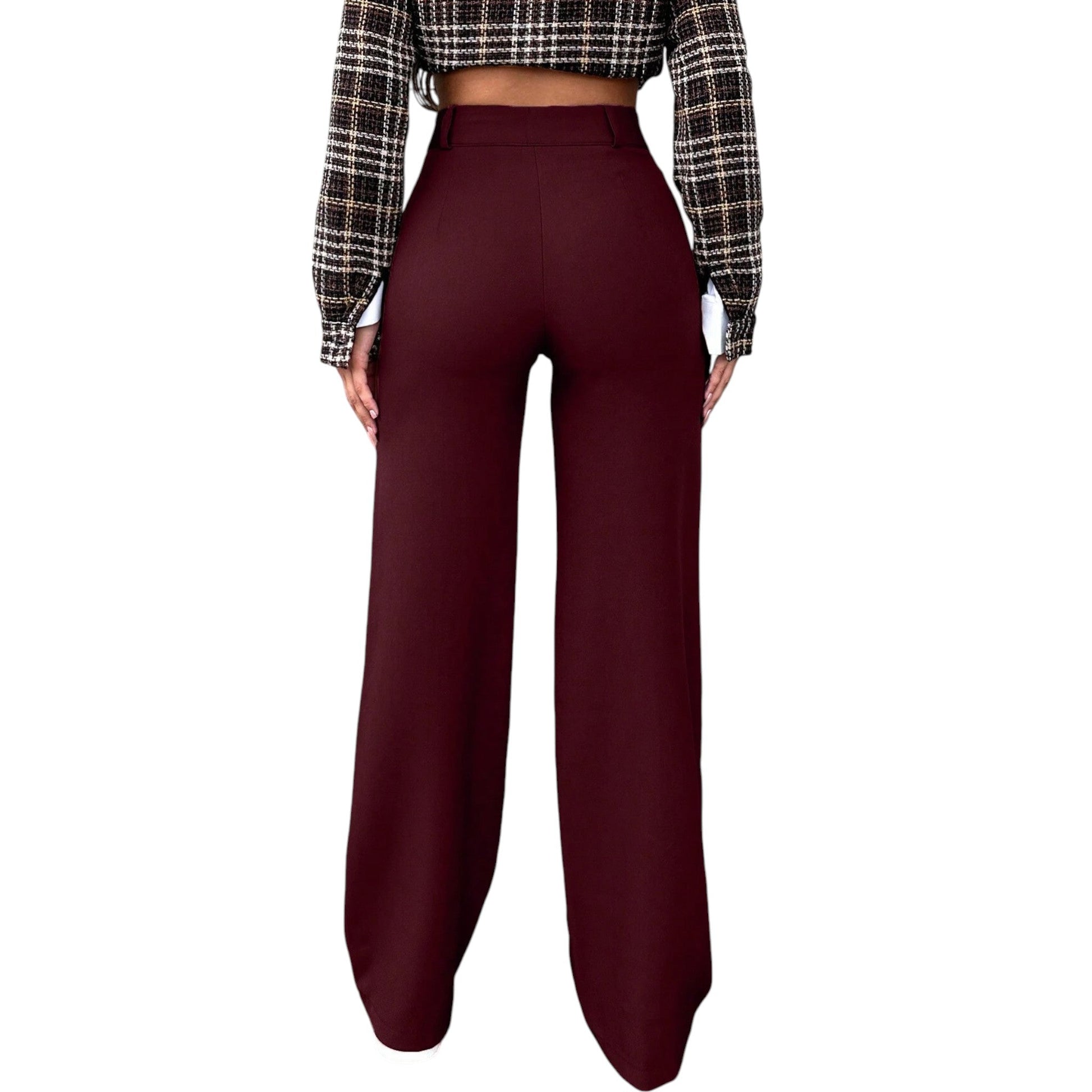 Címke nélküli, bordó, magas derekú, széles szárú nadrág, elöl gombos és cipzáras záródás, elöl hajtások, oldalt zsebek.