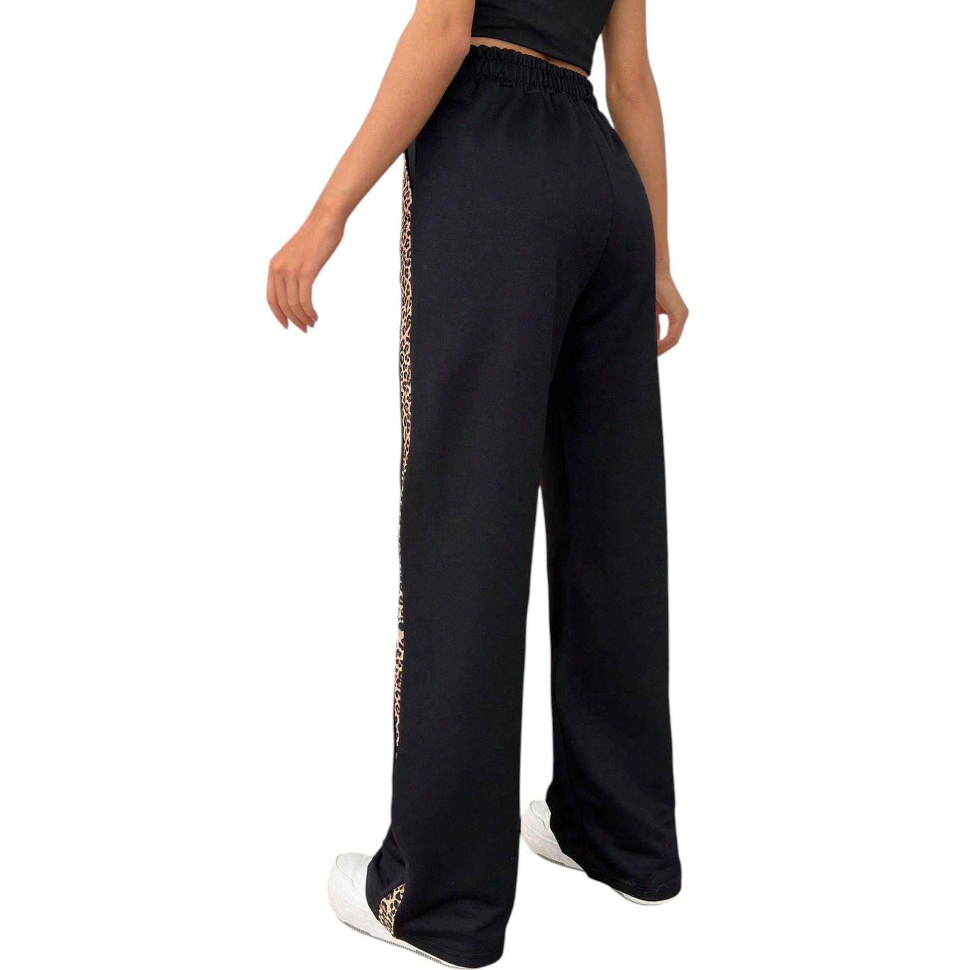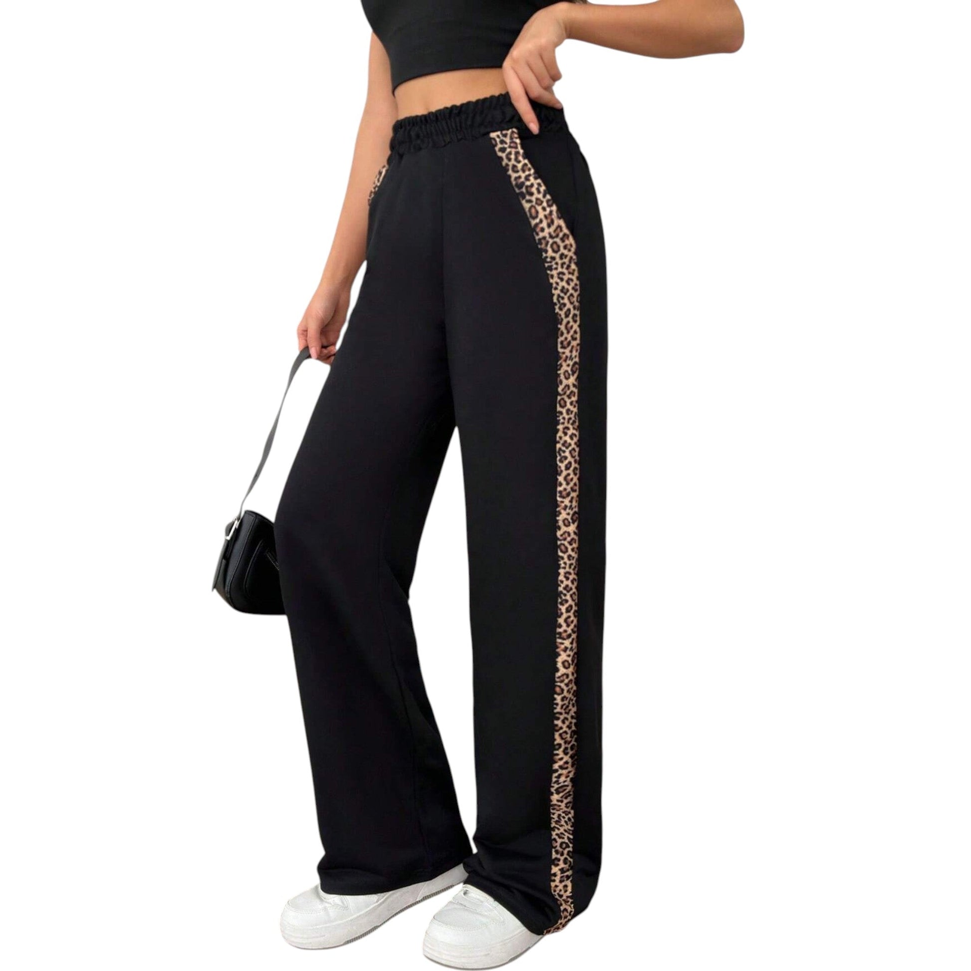 Címke nélküli, fekete, magas derekú, bő szárú nadrág, oldalt leopárdmintás csíkkal.