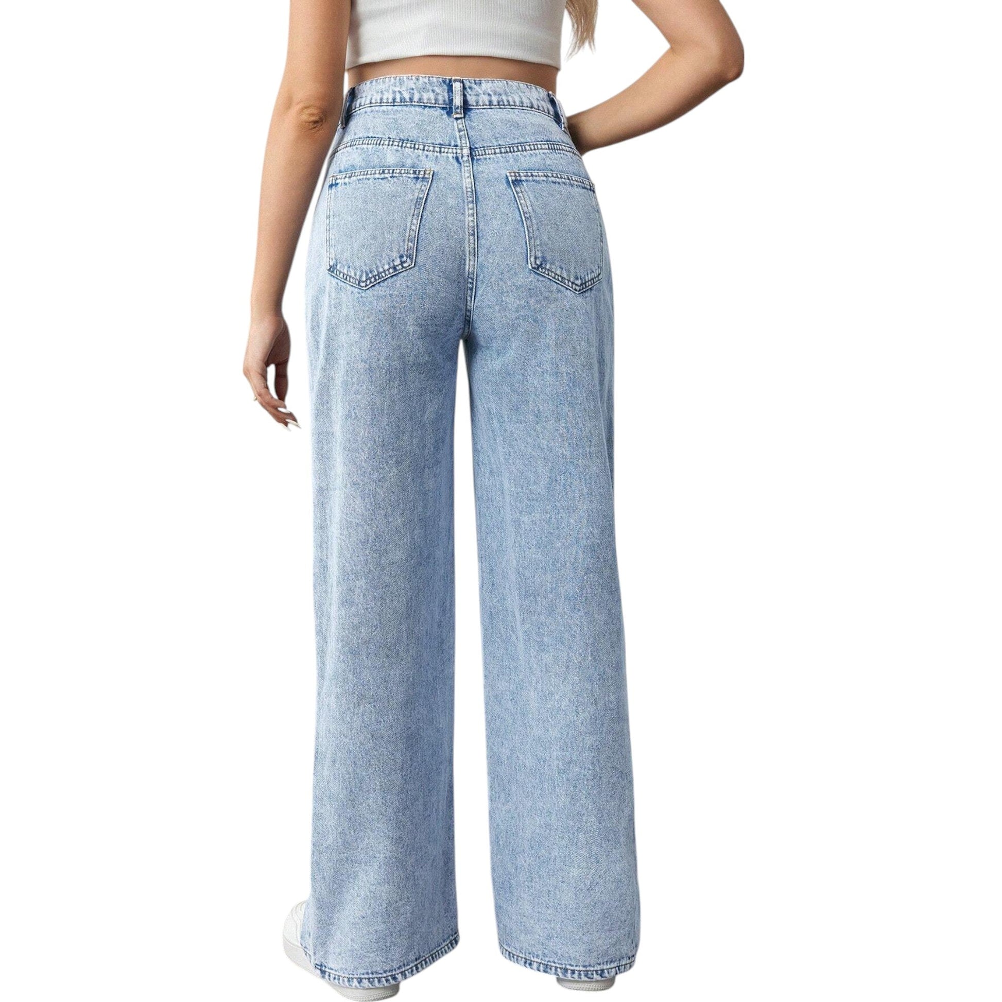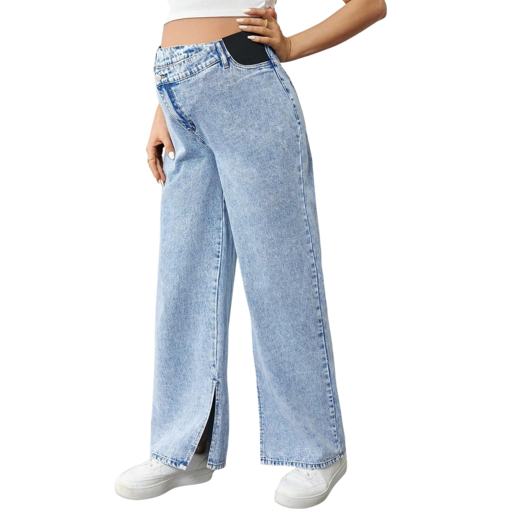 Címke nélküli, világoskék, kismama, hasított szárú, egyenes szabású farmer nadrág, elöl cipzáras és gombos záródással.