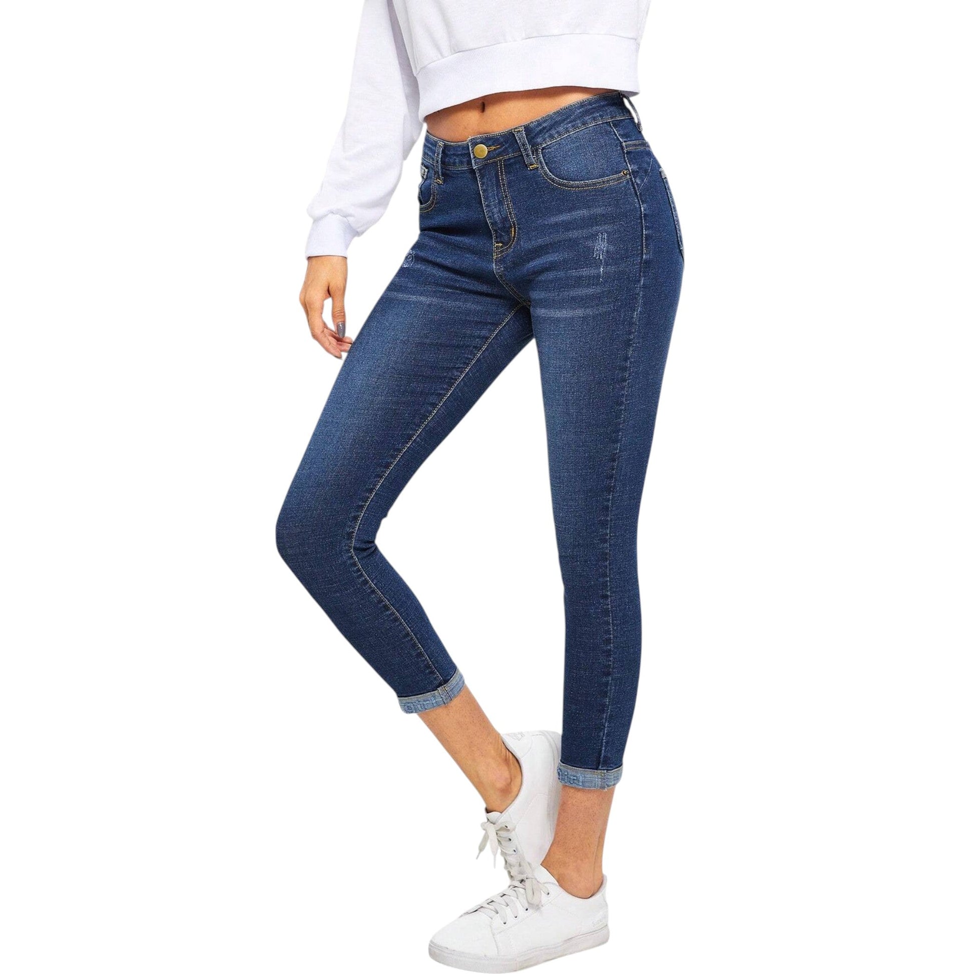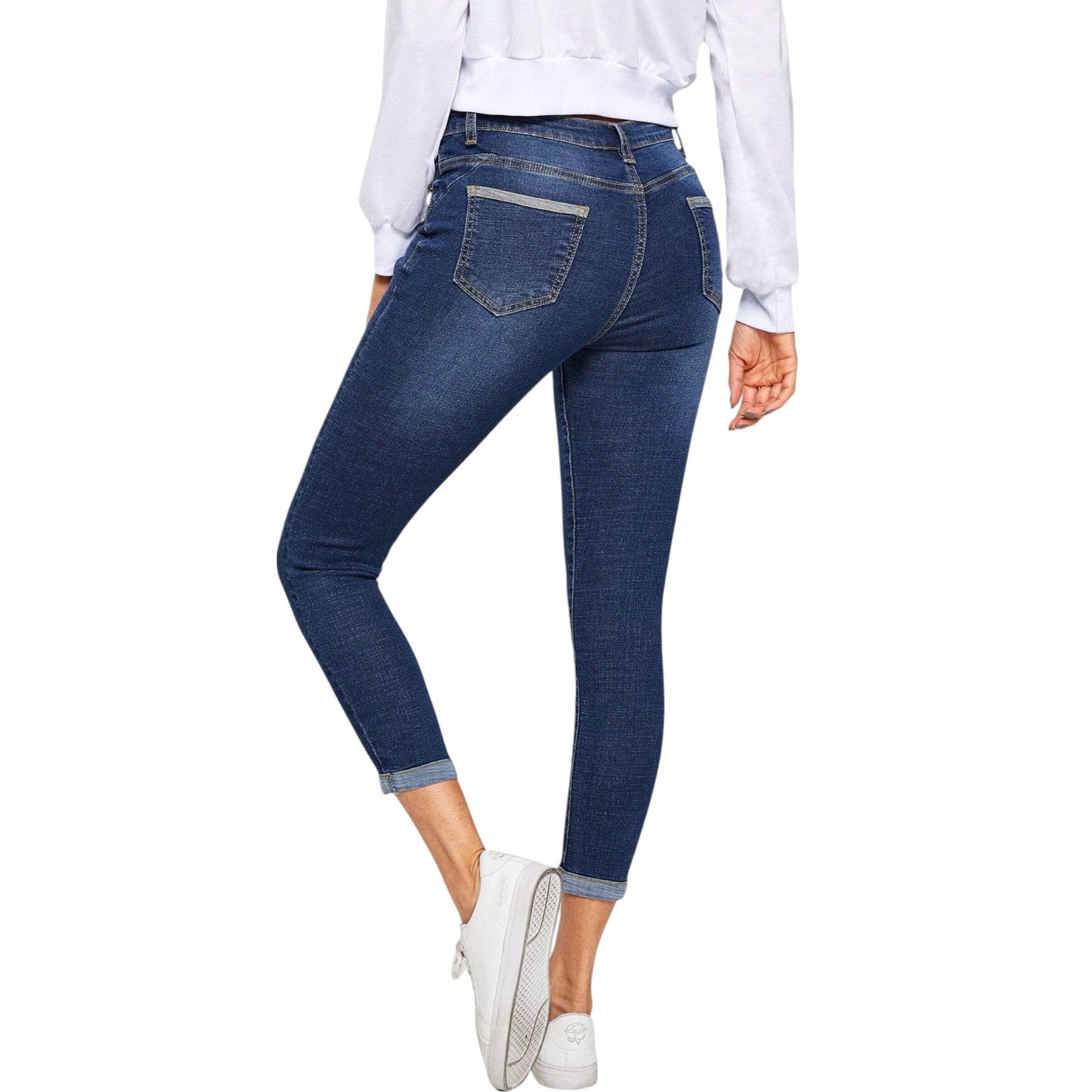 Címke nélküli, kék, slim fit, magas derekú, koptatott hatású, felhajtott szárú.