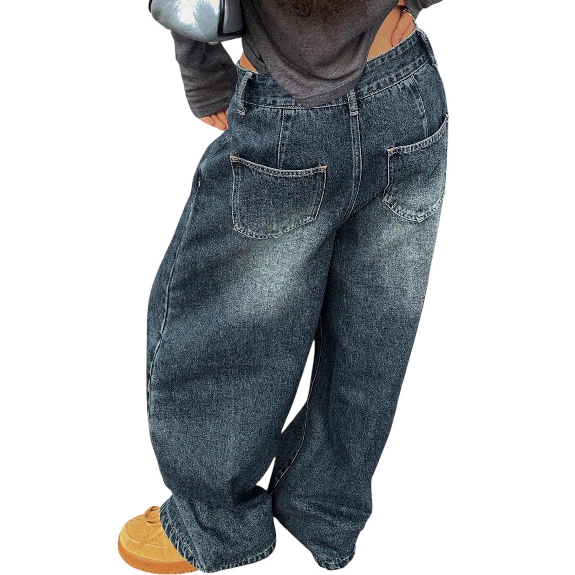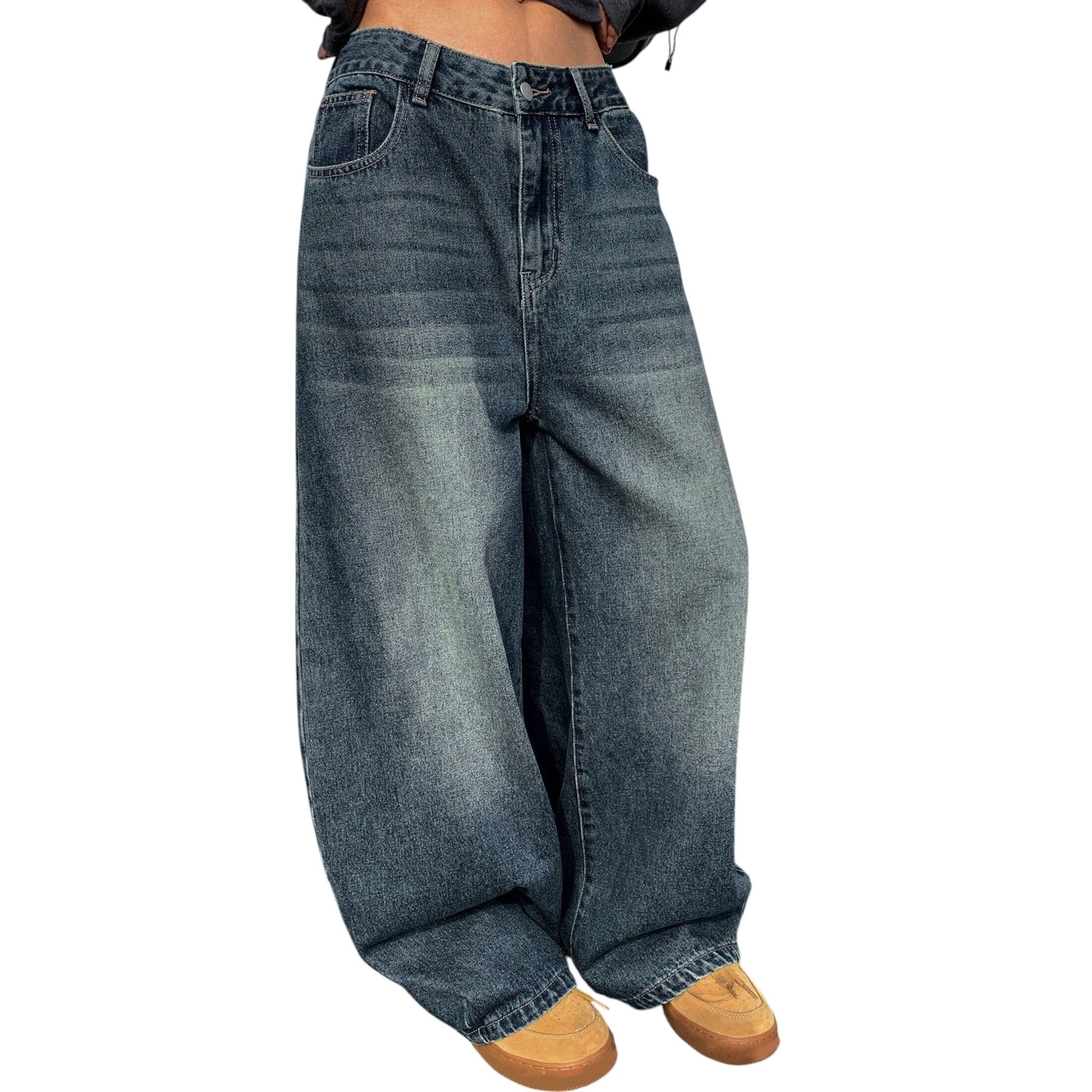 Címke nélküli, sötétkék, magas derekú, buggyos szabású farmer nadrág.