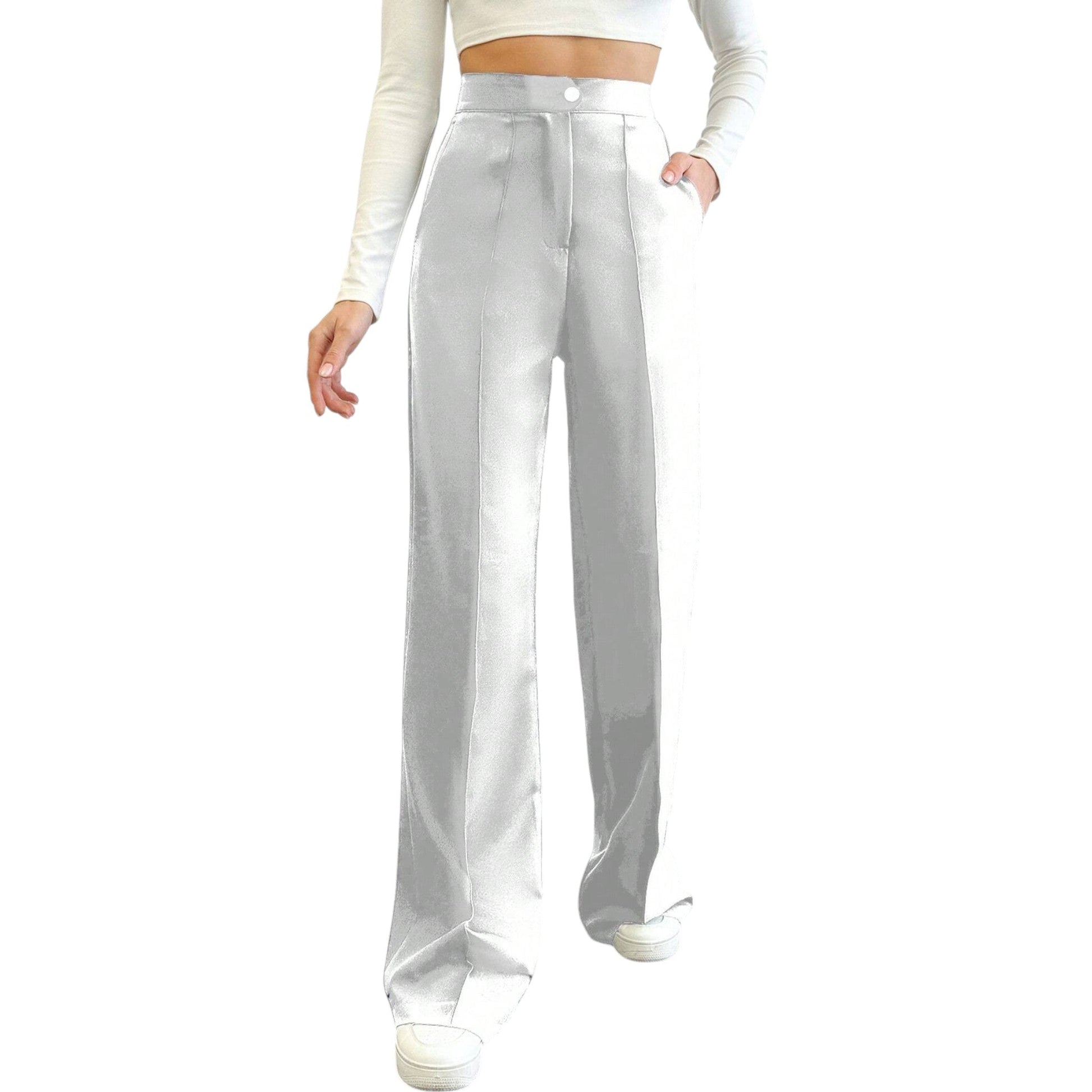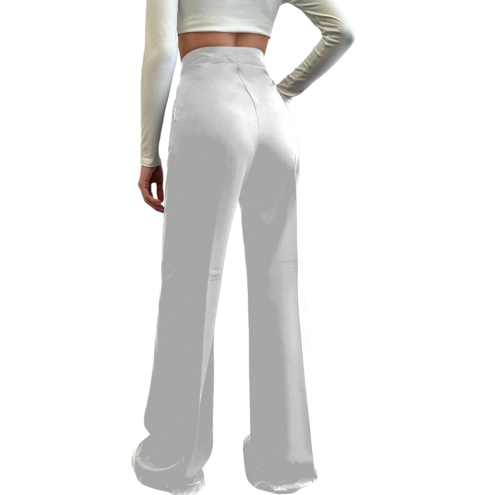 Címke nélküli, fehér, magas derekú, szatén anyagú, bő szárú palazzo nadrág, elől gombos záródással.