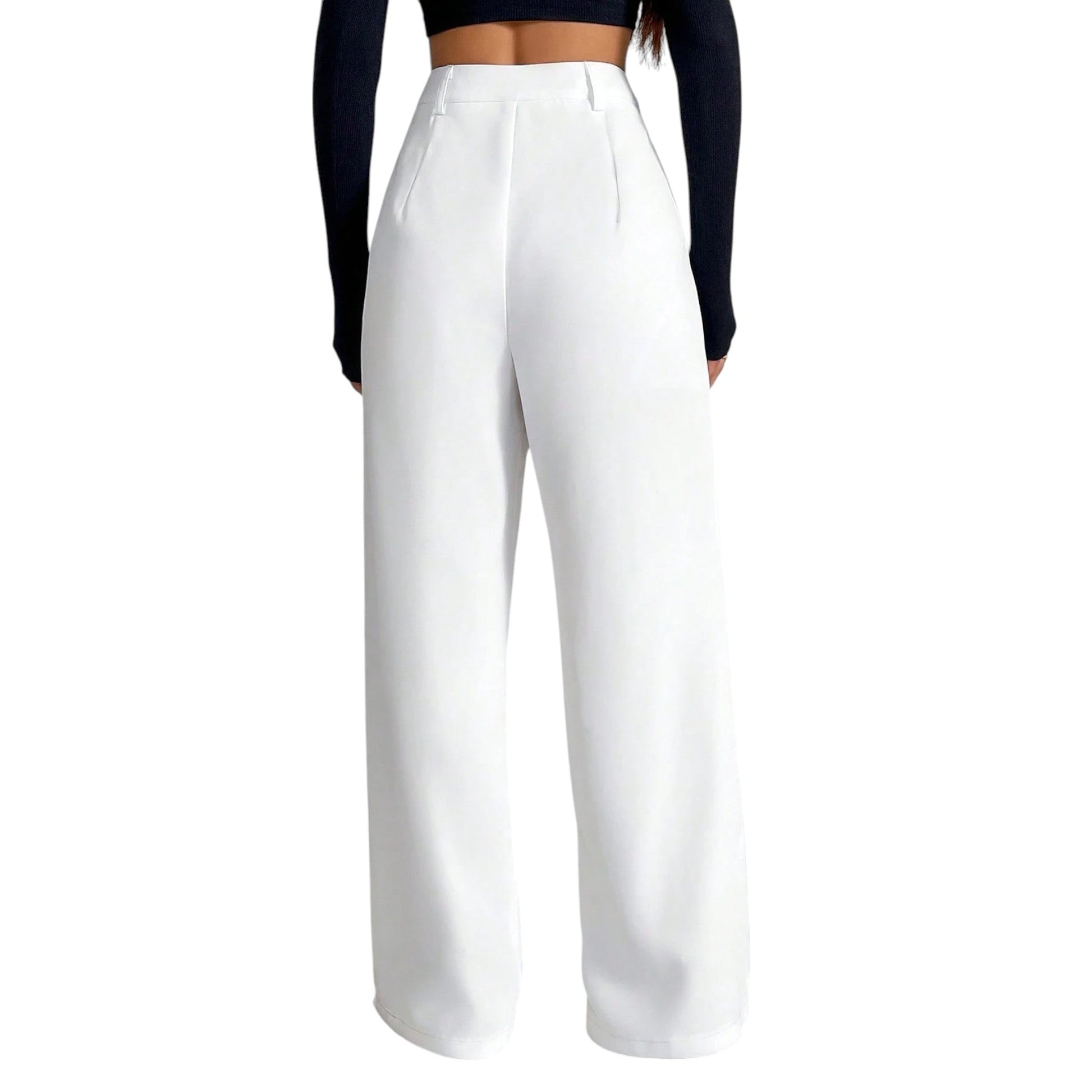 Címke nélküli, fehér, magas derekú, ráncolt elejű, cipzáras, széles szárú nadrág.