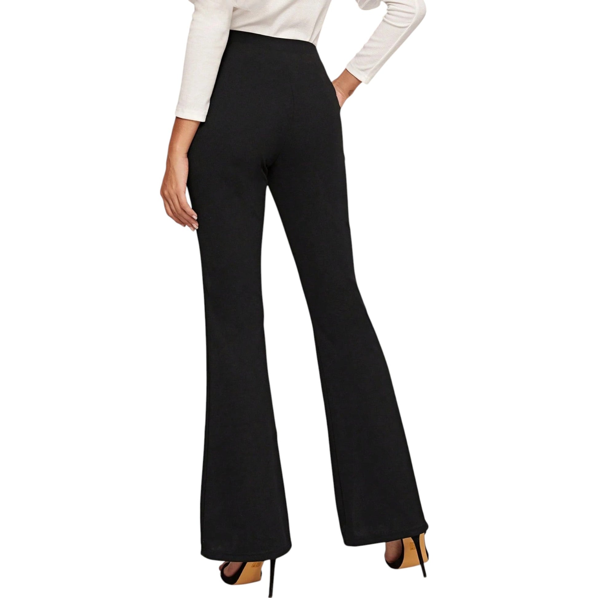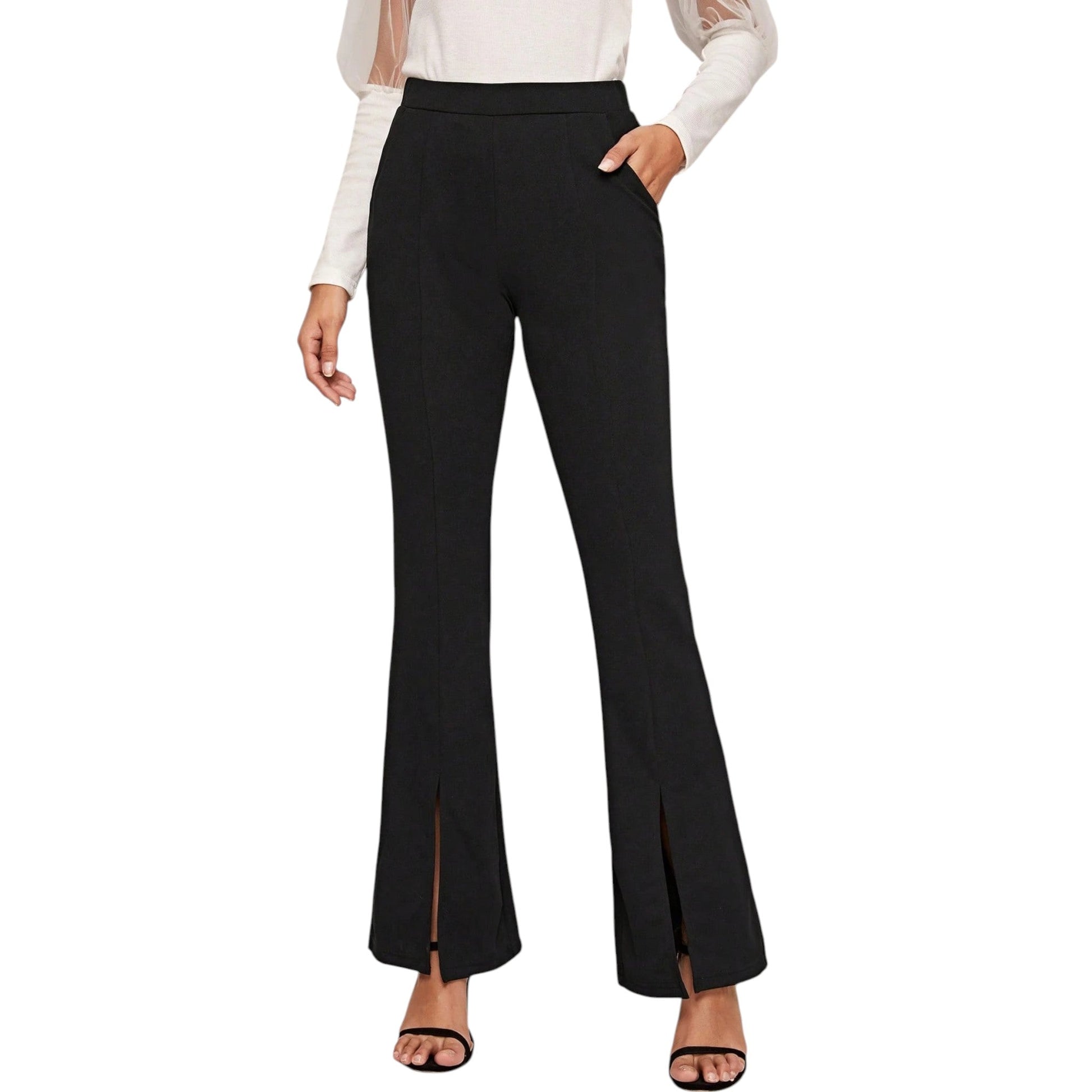 Címke nélküli, fekete, magas derekú, egyenes szárú nadrág, elől oldalt zsebekkel, elől alsó részen felsliccelve.