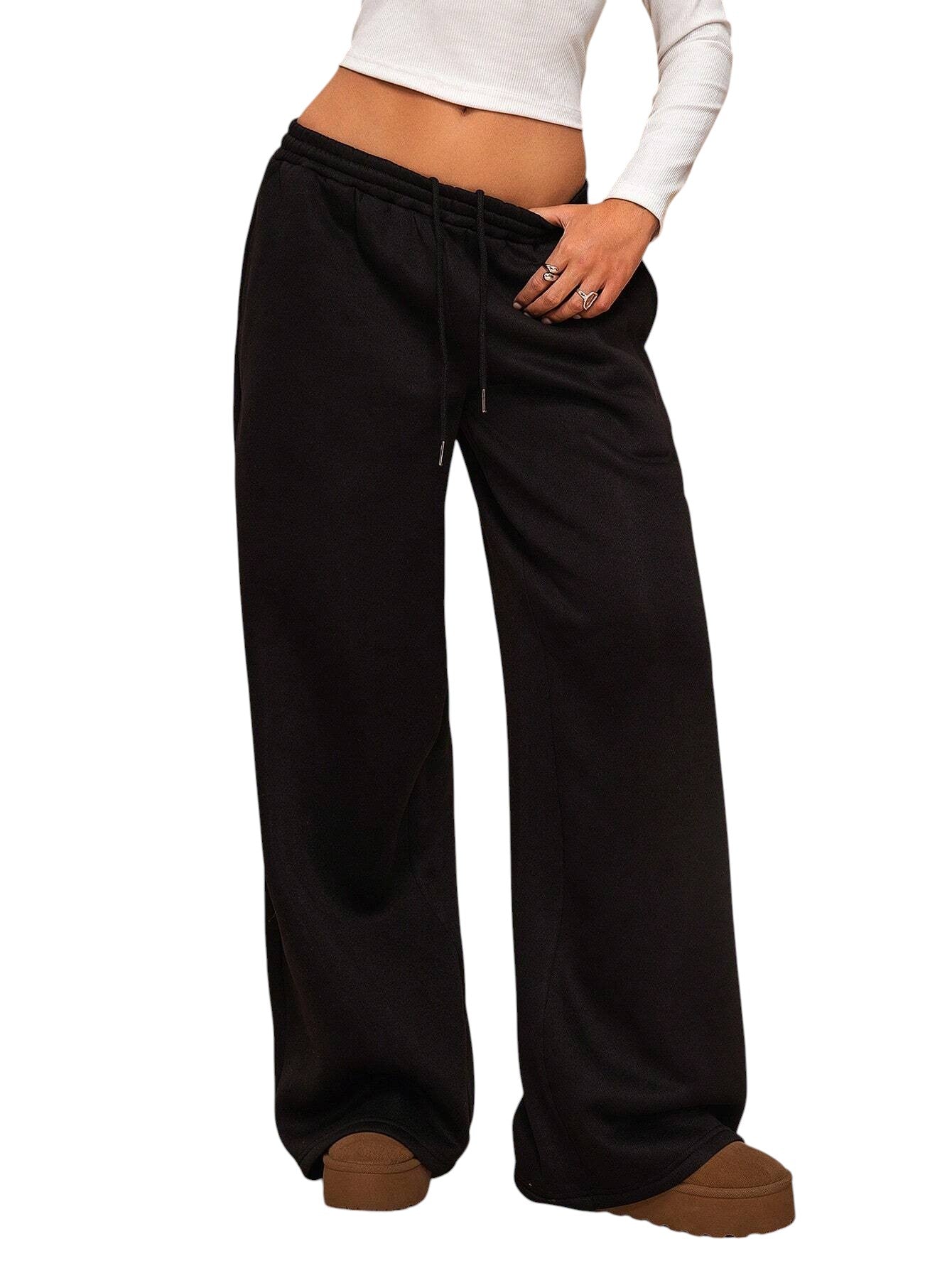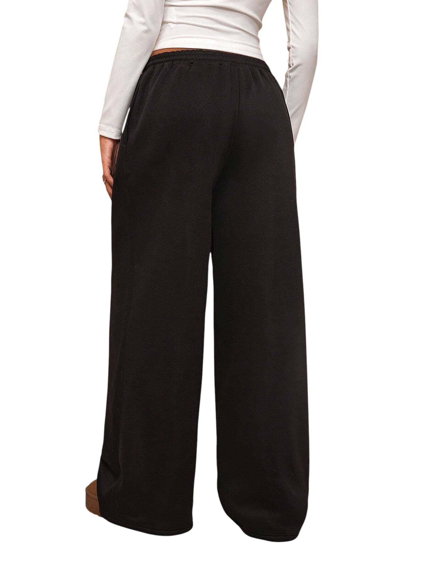 Címke nélküli, fekete, bő szárú melegítő nadrág, húzózsinóros derékkal.