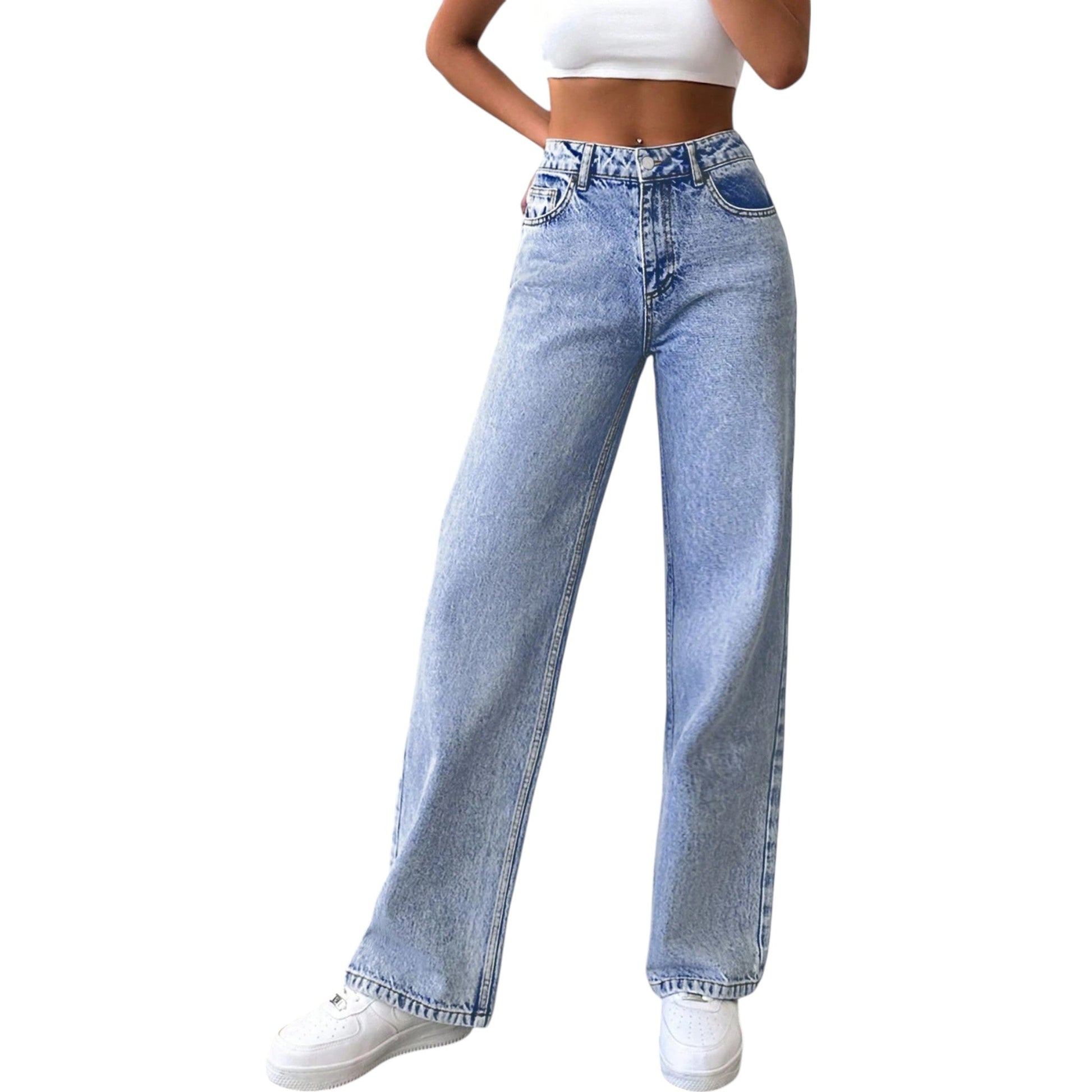 Címke nélküli, világoskék, egyenes szárú farmer nadrág. Magas derekú, cipzáras és gombos záródású, övtartókkal. Ötzsebes kialakítás, enyhén koptatott hatású.