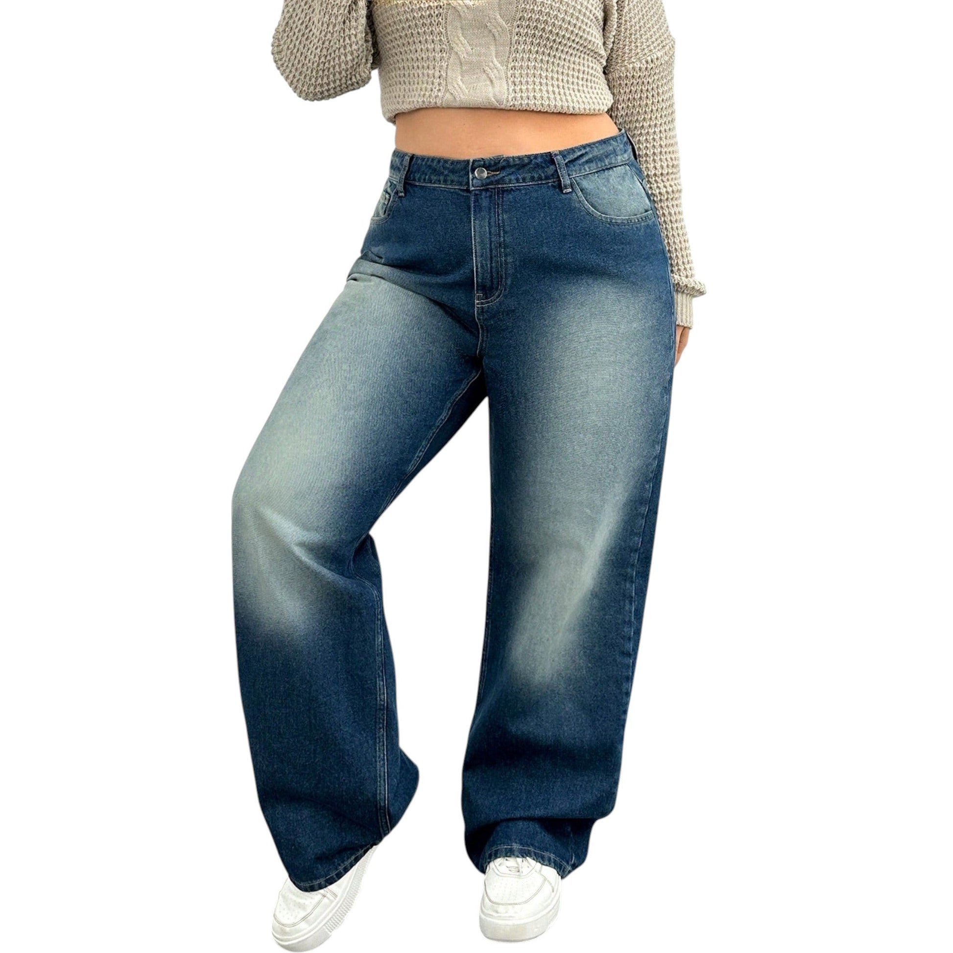 Címke nélküli, kék, bő szárú farmer nadrág, magas derekú, világosabb mosással a comboknál.