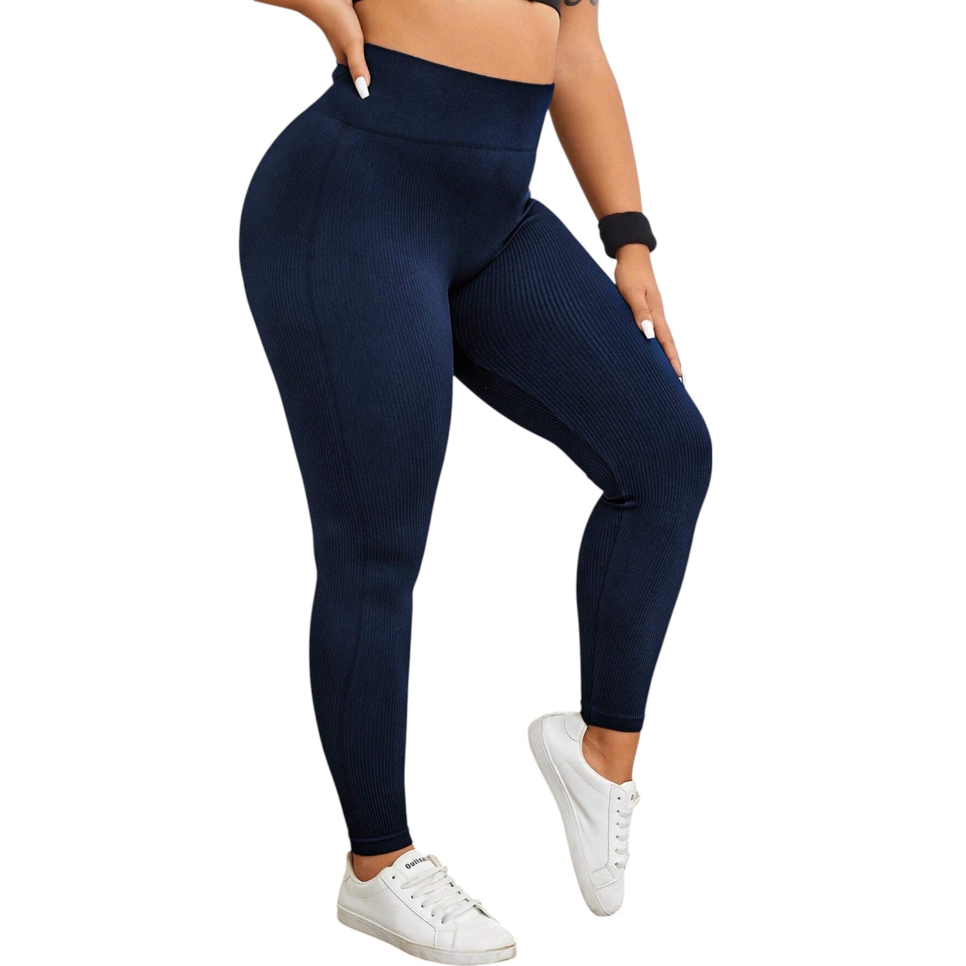 Címke nélküli, sötétkék színű, bordázott leggings. Magas derekú, testhezálló fazonú.