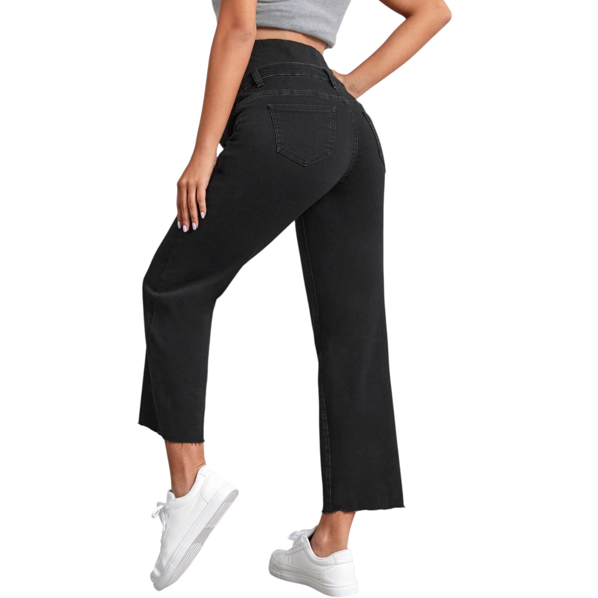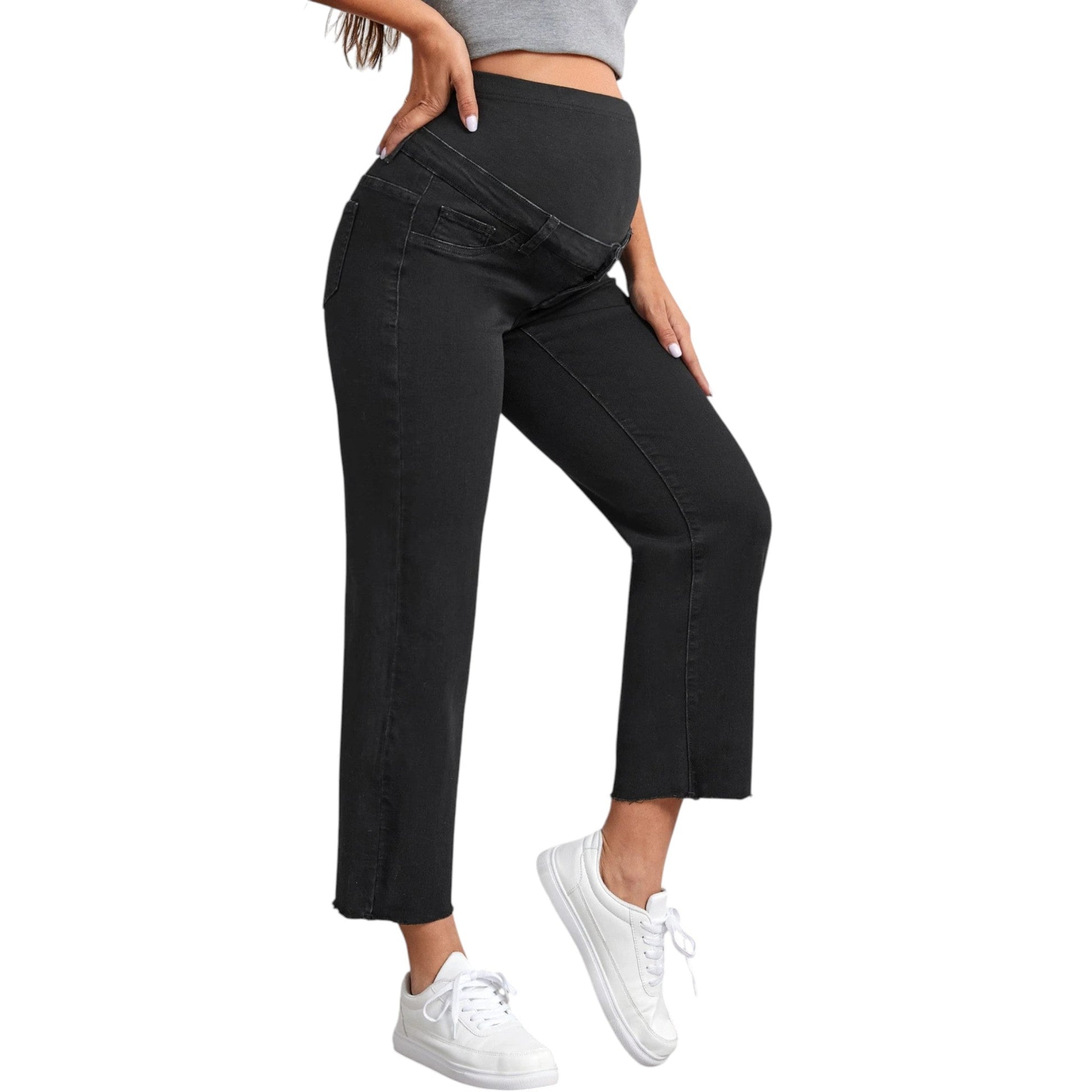 Címke nélküli, fekete, kismama farmer nadrág, rugalmas derékpánttal, egyenes szárú, crop szabású, nyers szélű.