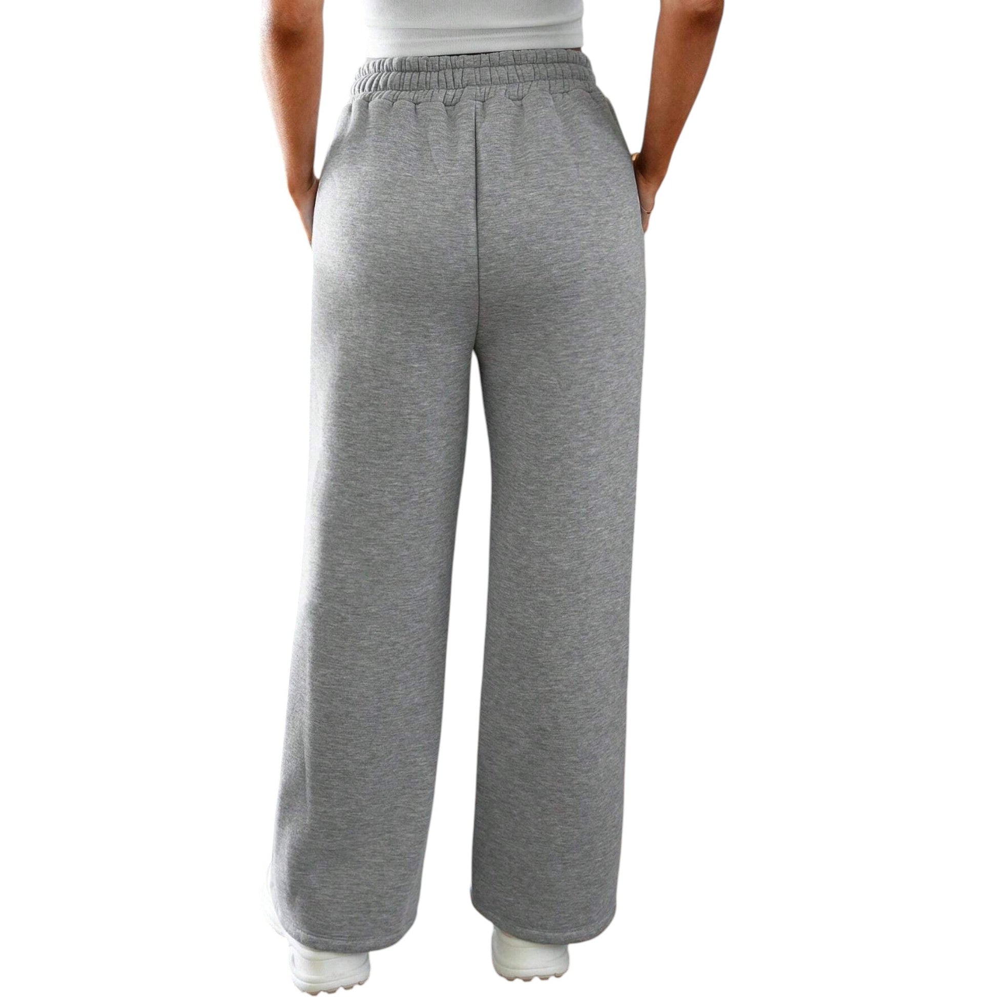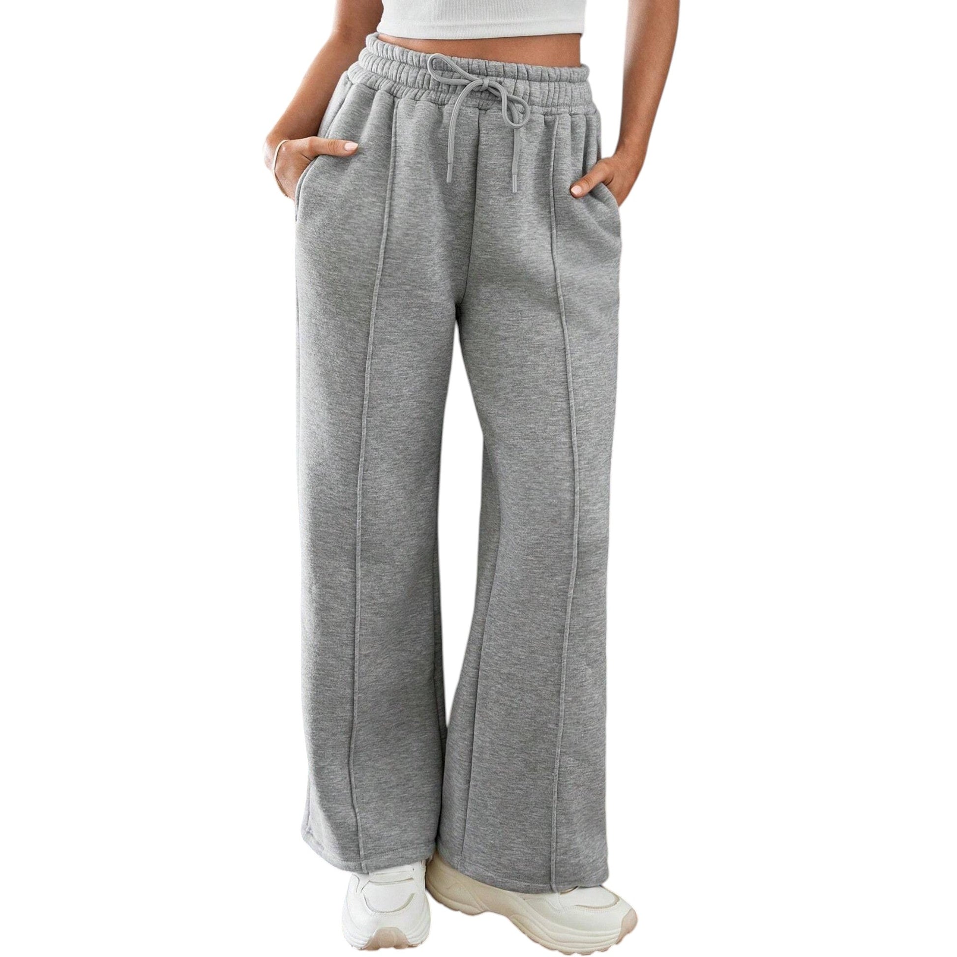 Címke nélküli, szürke, rugalmas, húzózsinóros derékpántú, széles szárú melegítő nadrág, elöl varrással díszített, oldalsó zsebekkel.