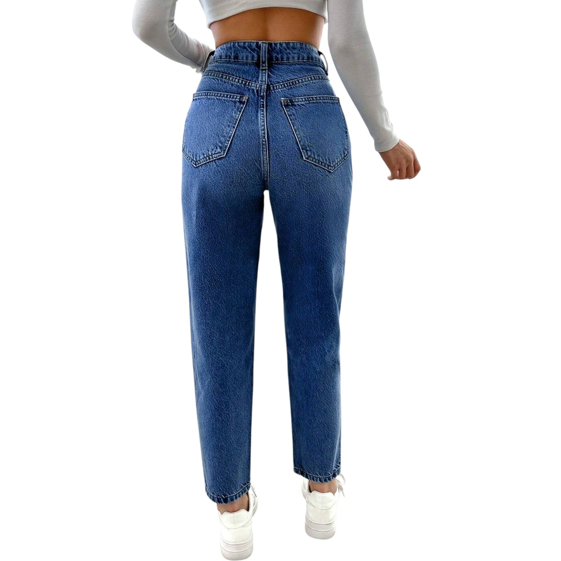 Címke nélküli, kék, szaggatott, magas derekú, egyenes szárú, mom fit farmer nadrág.