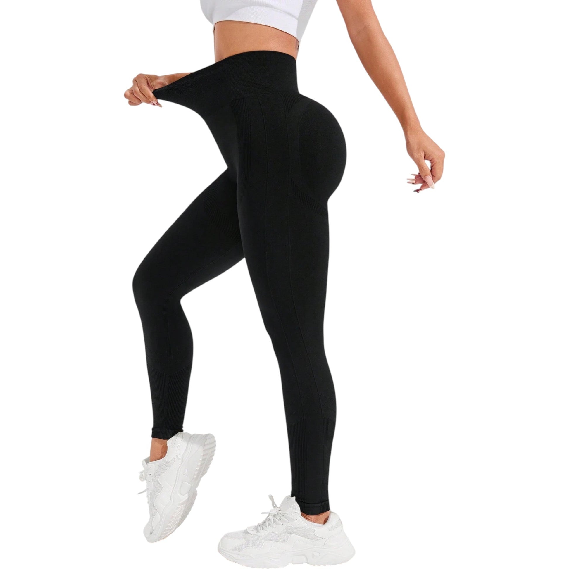 Címke nélküli, fekete, varrás nélküli, magas derekú, bordás leggings.