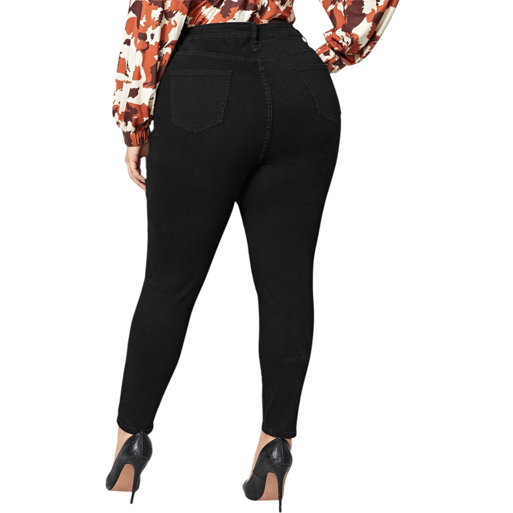 Címke nélküli, fekete, magas derekú, slim fit, elöl zsebes, gombos és cipzáras záródású farmer nadrág.
