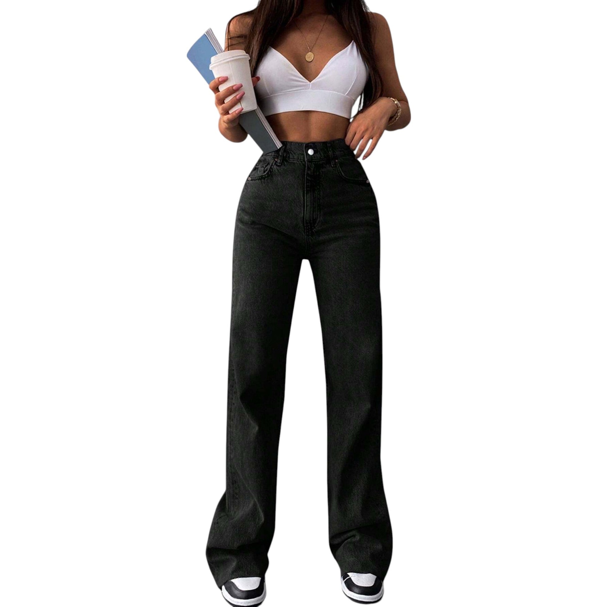 Címke nélküli, fekete, magas derekú, bő szárú farmer.