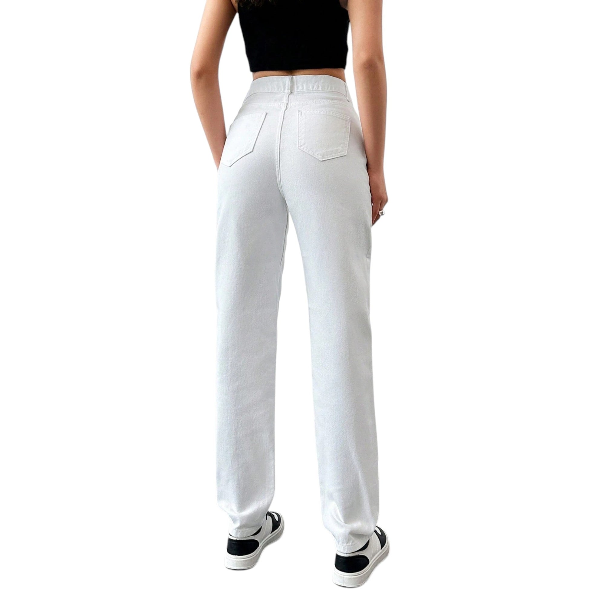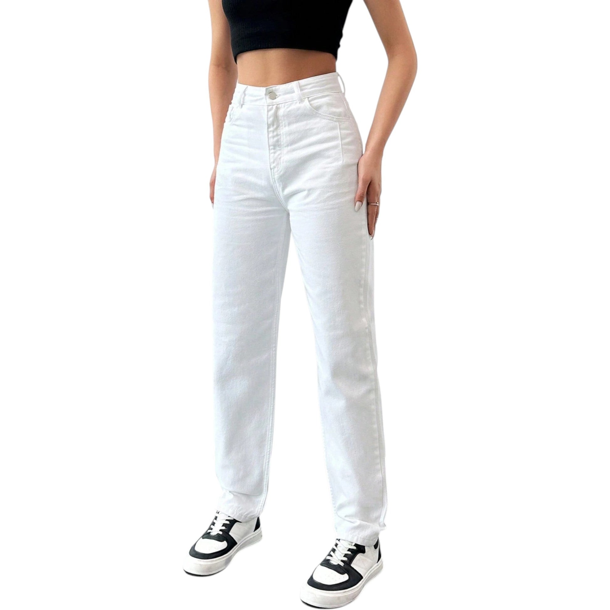 Címke nélküli, fehér, klasszikus derekú egyenes szárú farmer nadrág, gombos és cipzáras záródással, elöl és hátul zsebekkel.