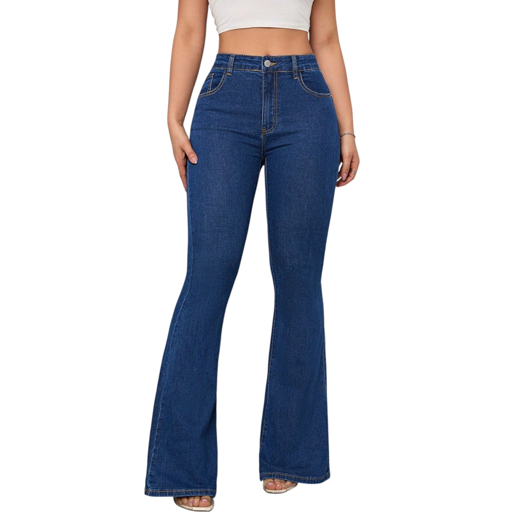 Címke nélküli, sötétkék, magas derekú trapézszárú farmer nadrág, gombos és cipzáras záródással, elöl és hátul zsebekkel.
