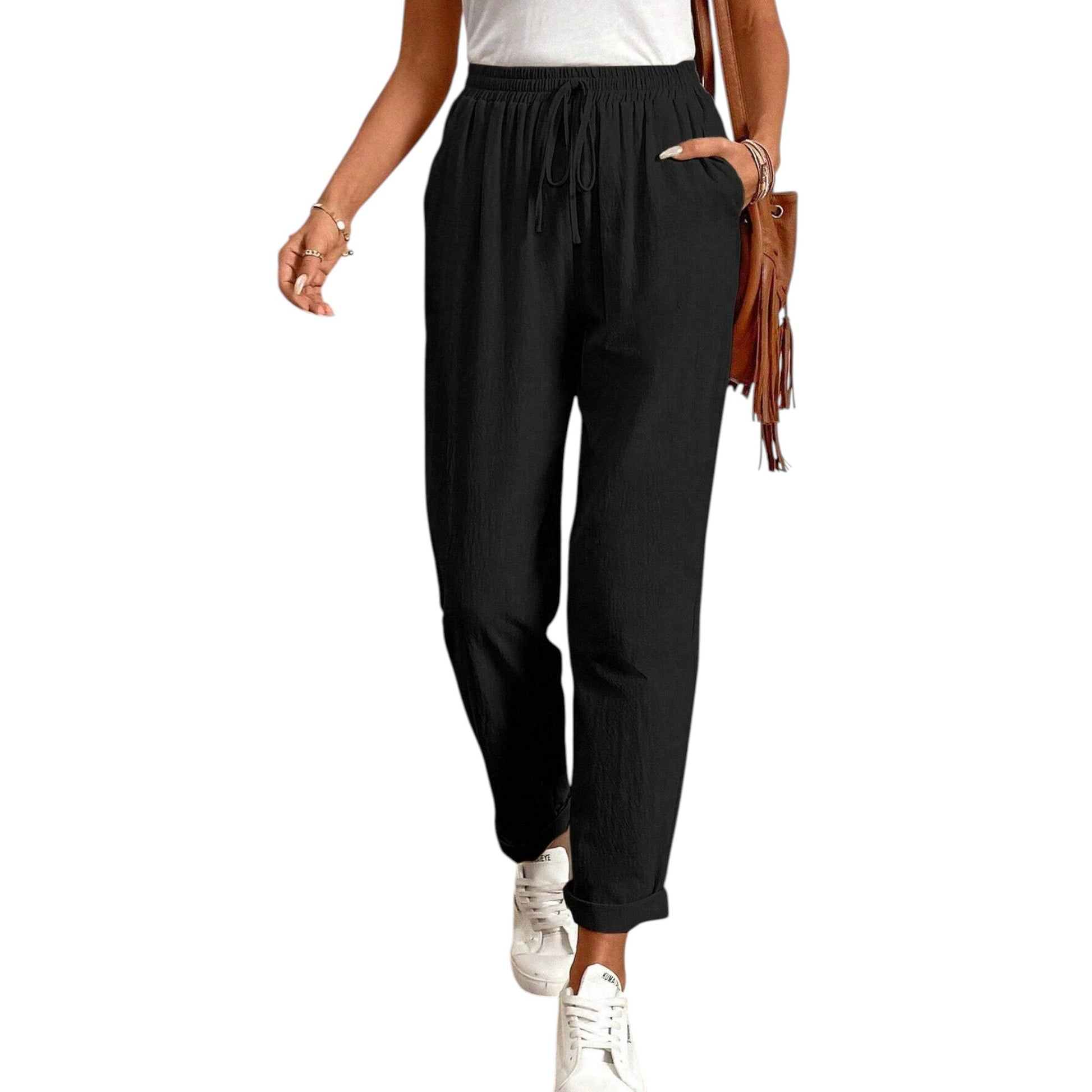 Címke nélküli, fekete, gumis derekú nadrág megkötővel, egyenes szárral, felhajtott szegéllyel, oldalsó zsebekkel, laza szabással.