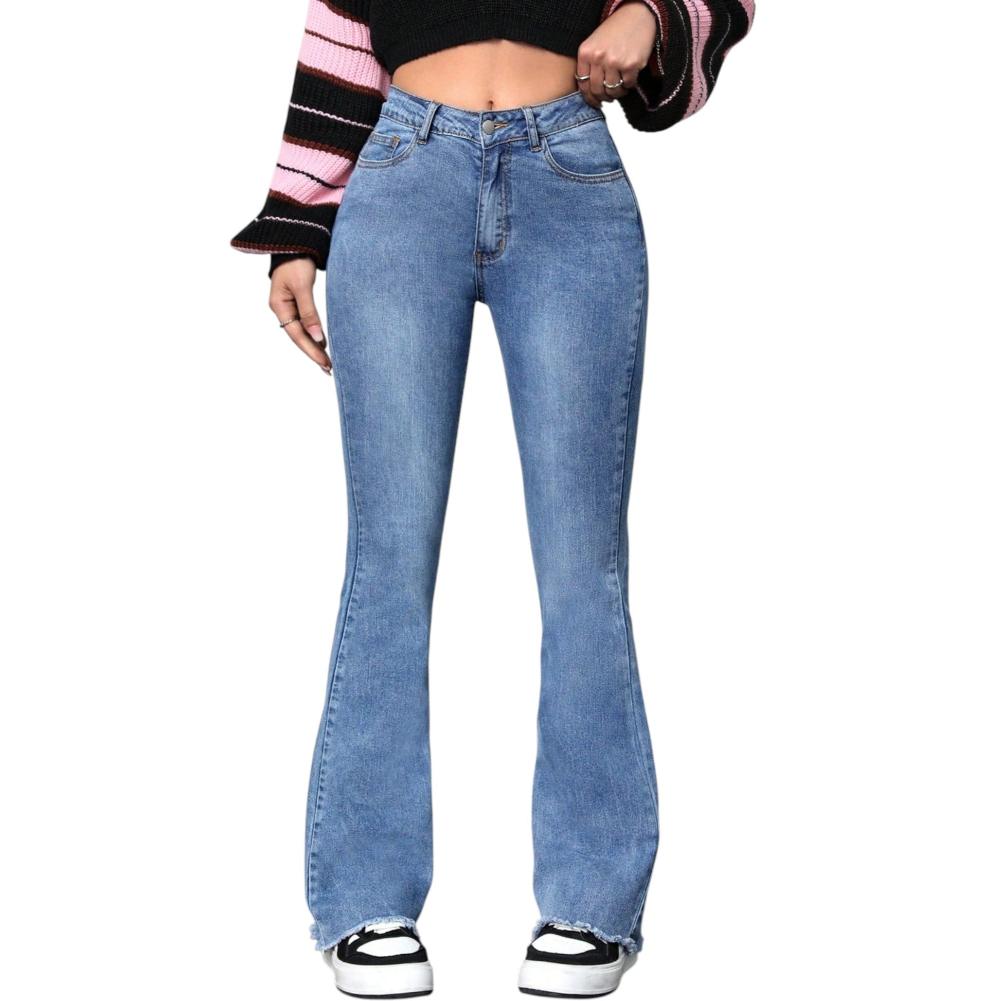 Címke nélküli, világoskék, magas derekú, szaggatott trapézszárú farmer nadrág, nyers szegéllyel, gombos és cipzáras záródással, elöl és hátul zsebekkel.