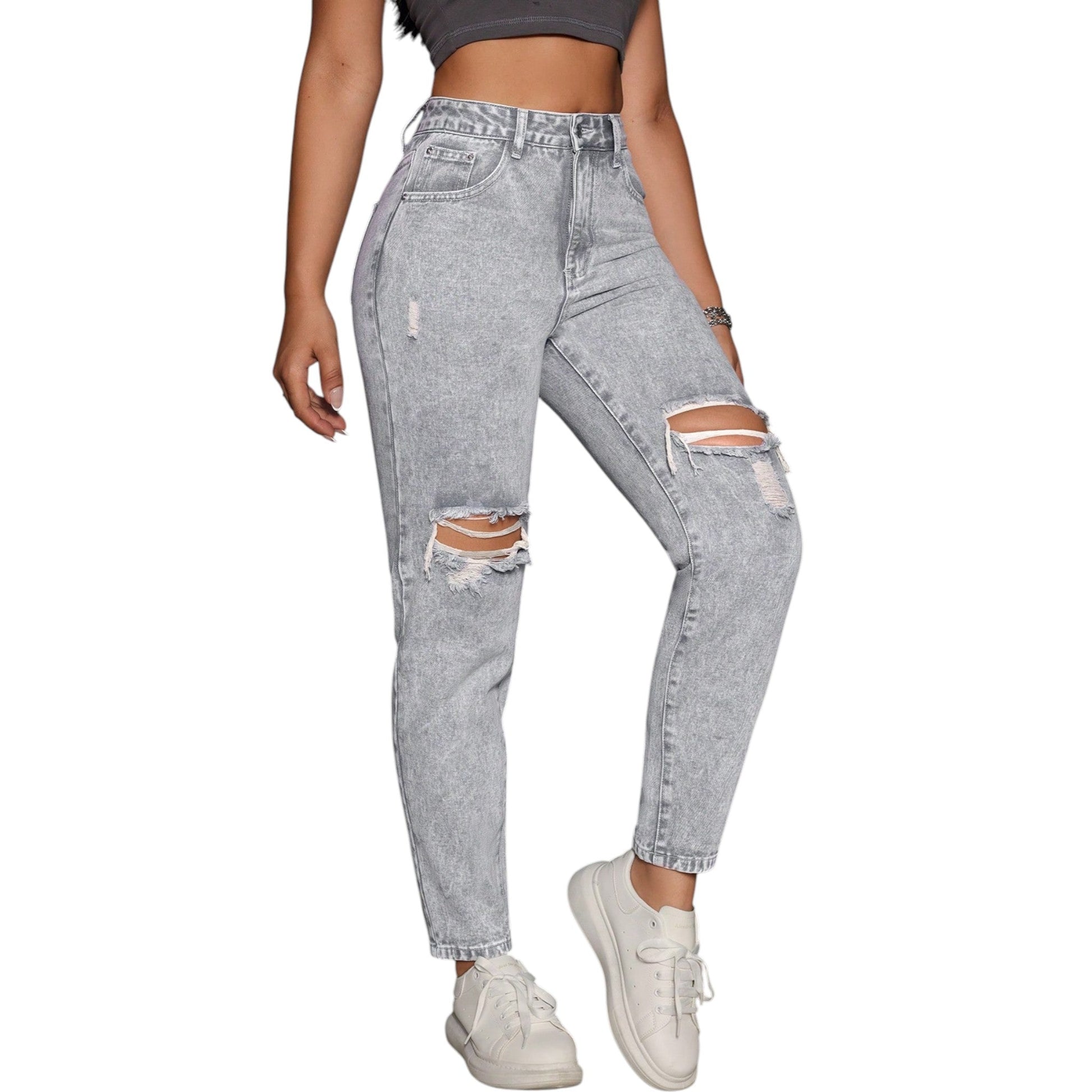 Címke nélküli, szürke, magas derekú, szaggatott, mom fit farmer nadrág.