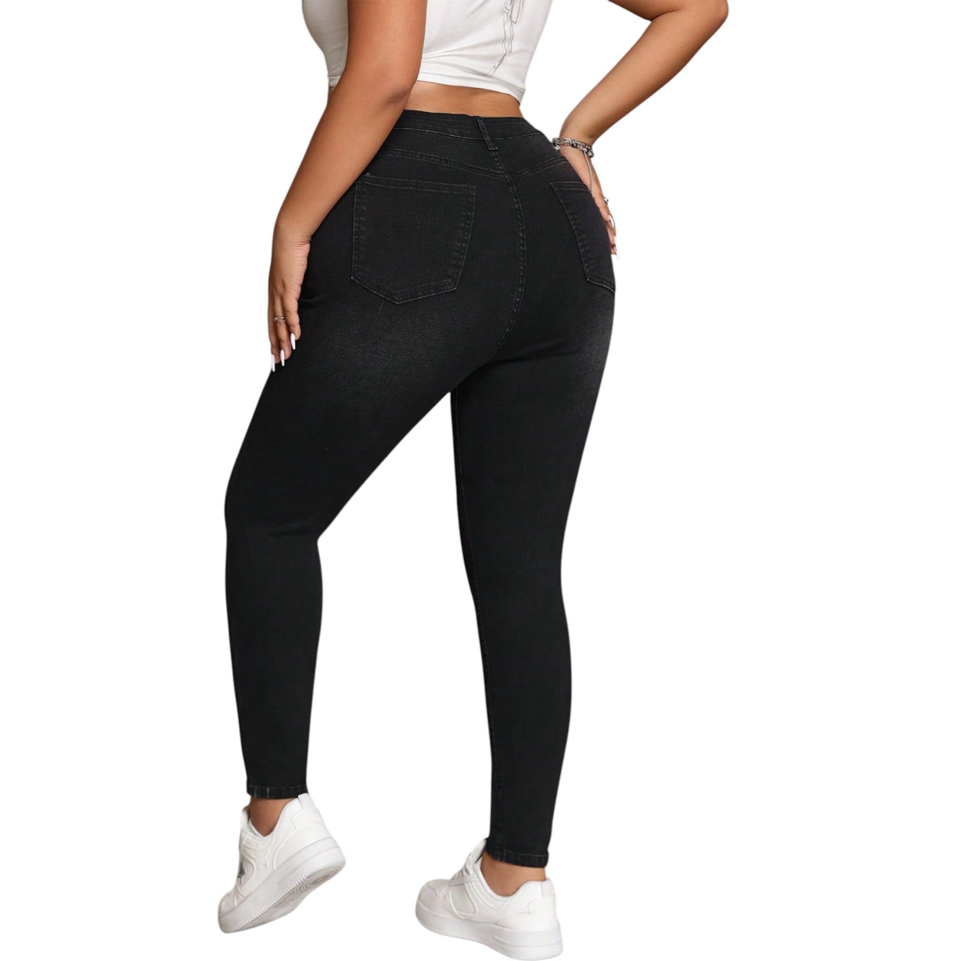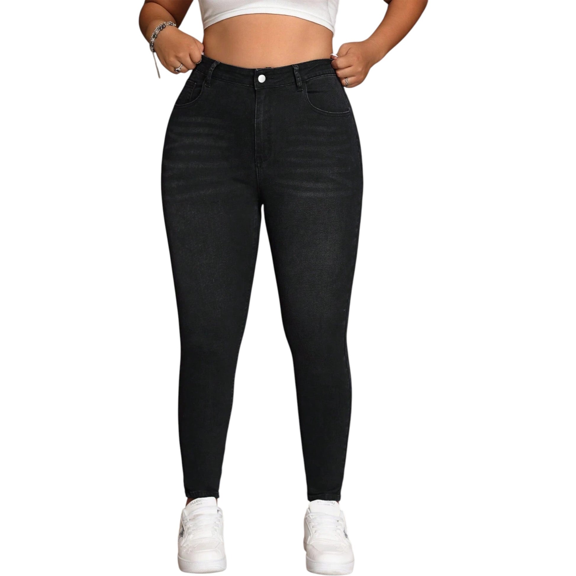 Címke nélküli, fekete, magas derekú slim fit farmer nadrág, gombos és cipzáras záródással, elöl és hátul zsebekkel.