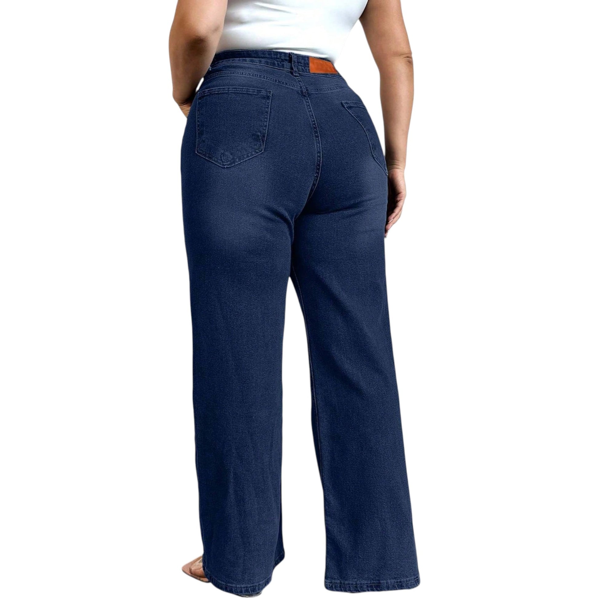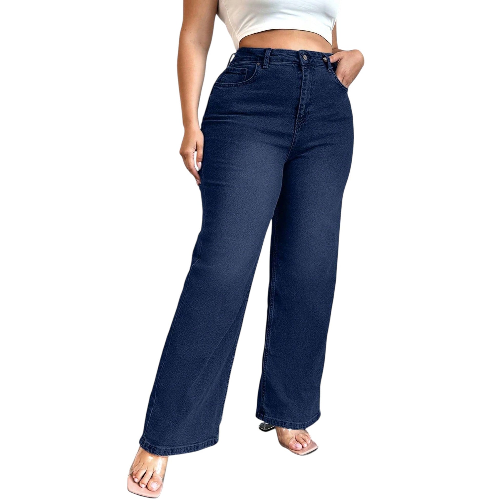 Címke nélküli, sötétkék, magas derekú, egyenes szárú farmer.