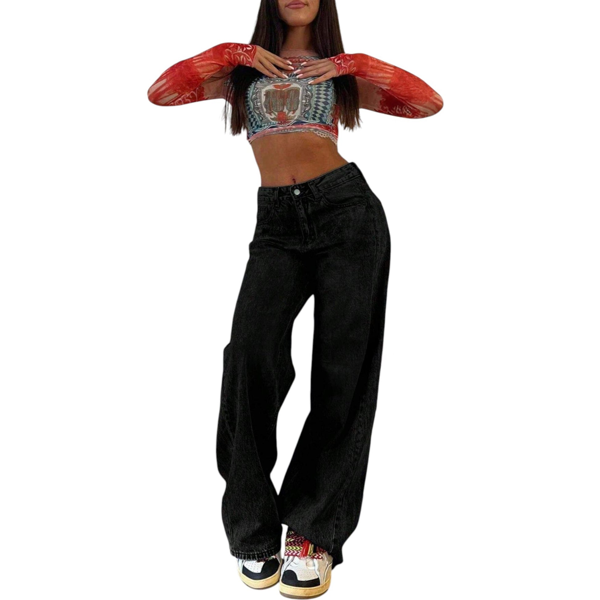 Címke nélküli, fekete, magas derekú bő szabású farmer nadrág, gombos és cipzáras záródással, elöl és hátul zsebekkel.