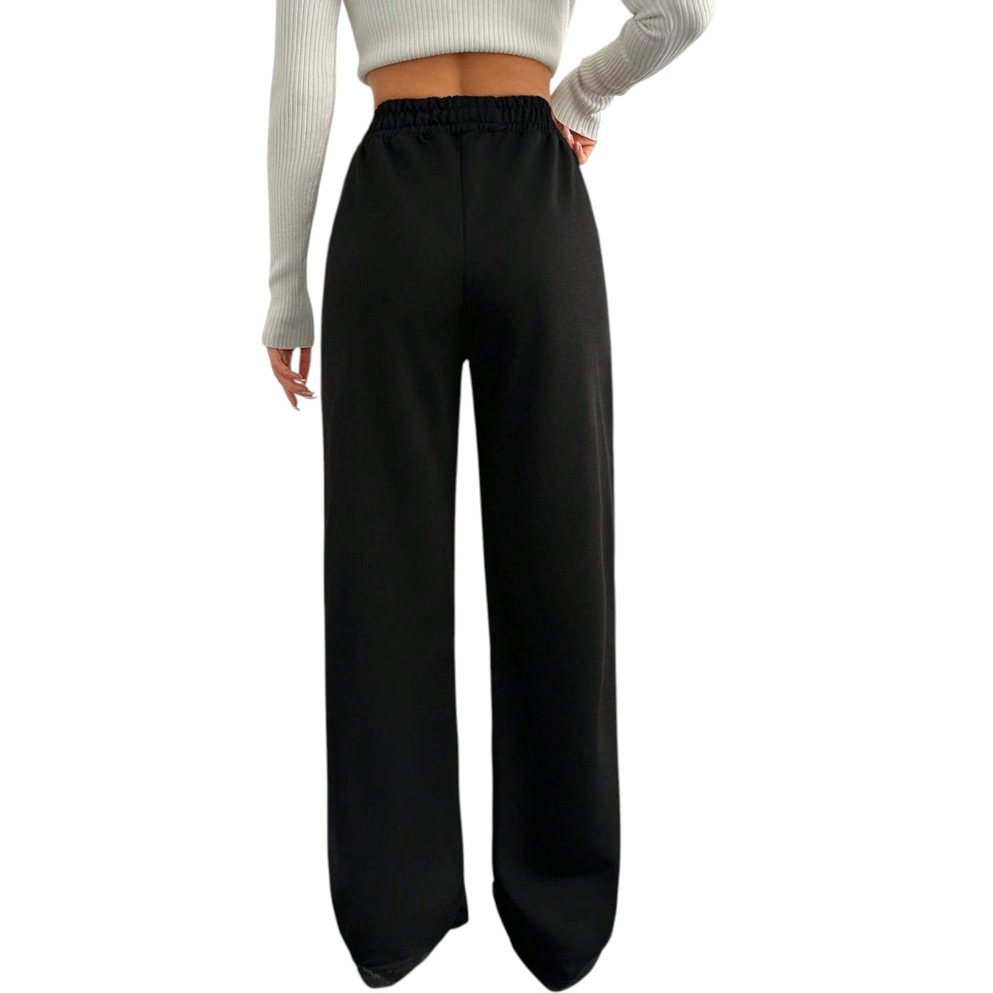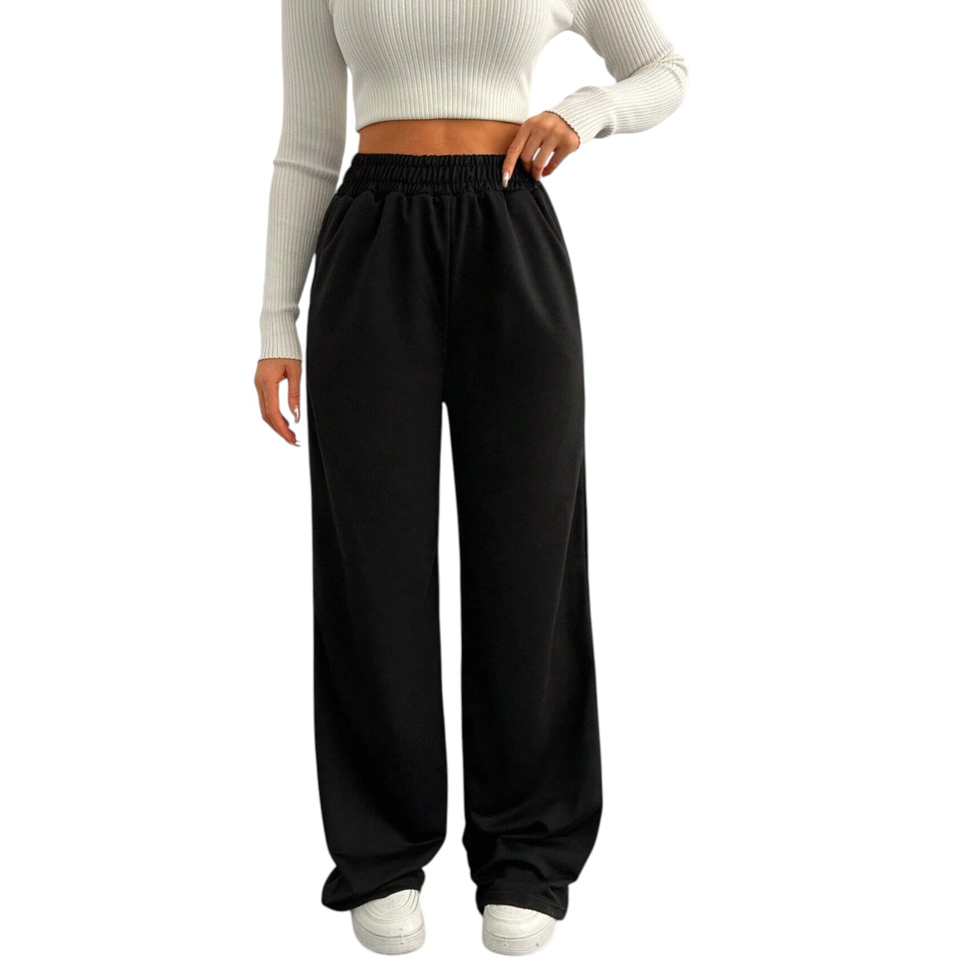 Címke nélküli, fekete, magas derekú, gumis derekú, bő szárú szabadidő nadrág.